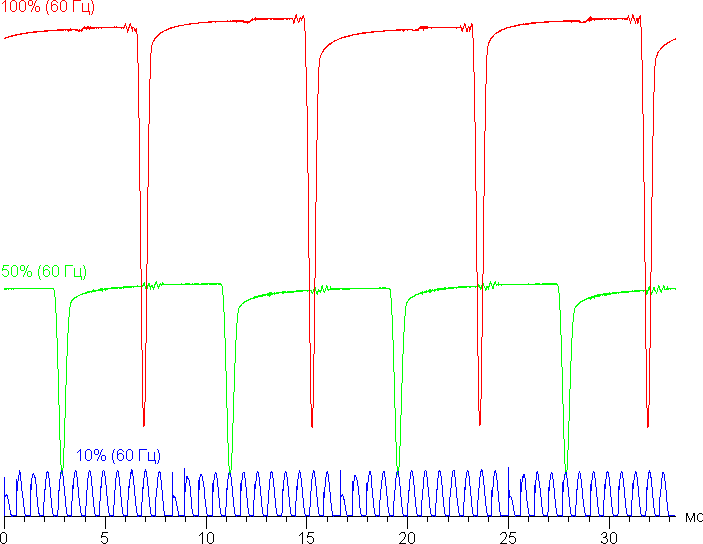 На высоком и среднем уровне яркости присутствует значимая модуляция с частотой 120 Гц. На рисунках ниже приведены зависимости яркости (вертикальная ось) от времени (горизонтальная ось) для нескольких значений настройки яркости. Сначала для режима с частотой обновления 60 Гц: