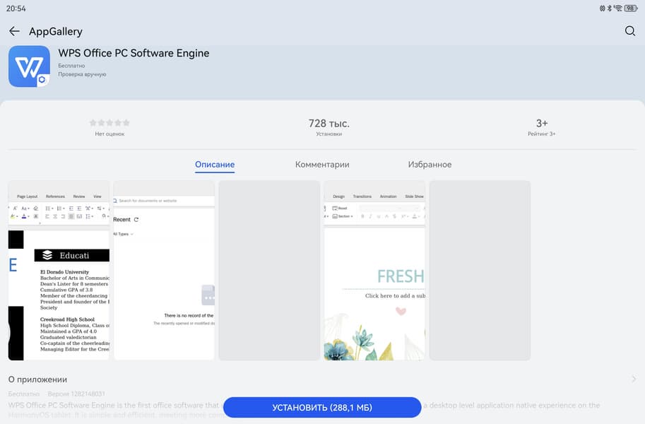 Из главных новшеств в плане предустановленного ПО отметим наличие бесплатной полнофункциональной ПК-версии офисного пакета WPS Office (точнее, возможности загрузить его из AppGallery). Да-да, он представлен именно в десктопном варианте, тогда как раньше на планшетах Huawei мы видели мобильную версию. Для тех, кто серьезно работает с текстом и таблицами, это большой плюс.