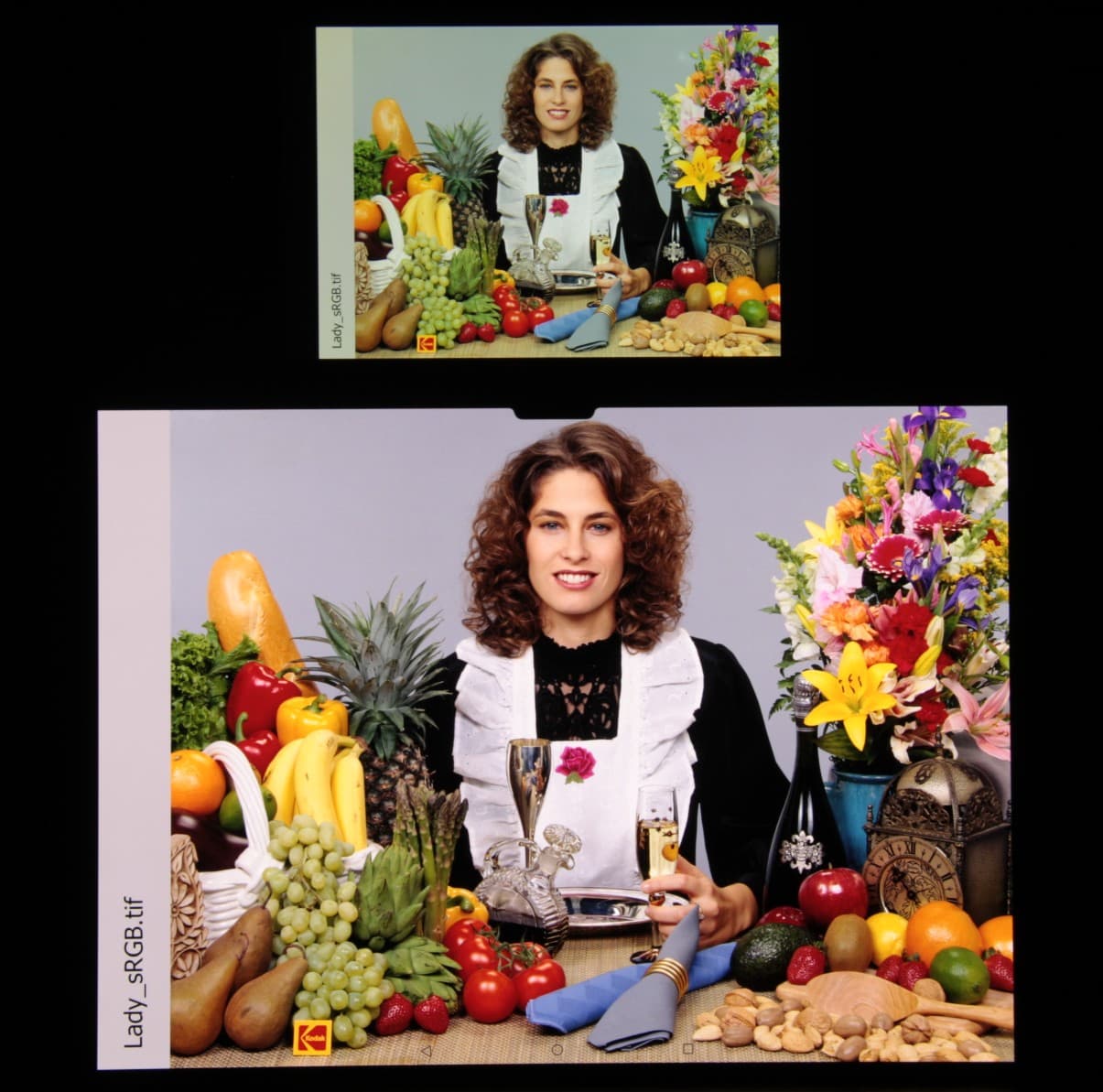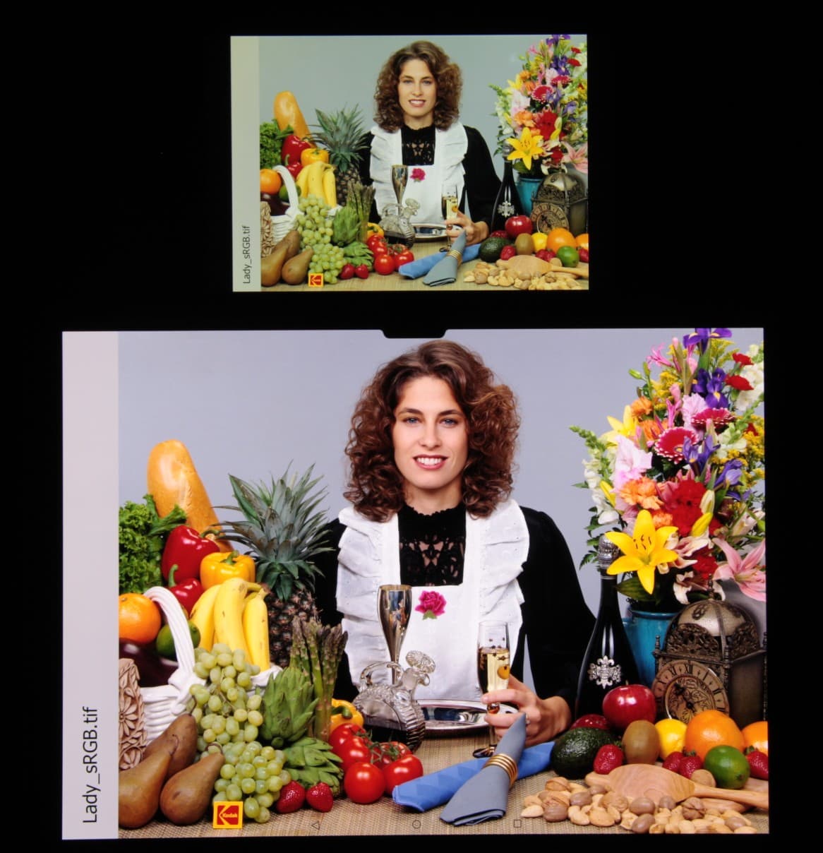 Цветопередача хорошая, цвета в меру насыщенные, цветовой баланс у экранов немного различается. Напомним, что фотография не может служить надежным источником сведений о качестве цветопередачи и приводится только для условной наглядной иллюстрации. В частности, выраженный красноватый оттенок белого и серого полей, присутствующий на фотографиях OLED-экрана, при перпендикулярном взгляде визуально отсутствует, что подтверждается аппаратными тестами с помощью спектрофотометра. Причина в том, что спектральная чувствительность матрицы фотоаппарата неточно совпадает с этой характеристикой человеческого зрения.