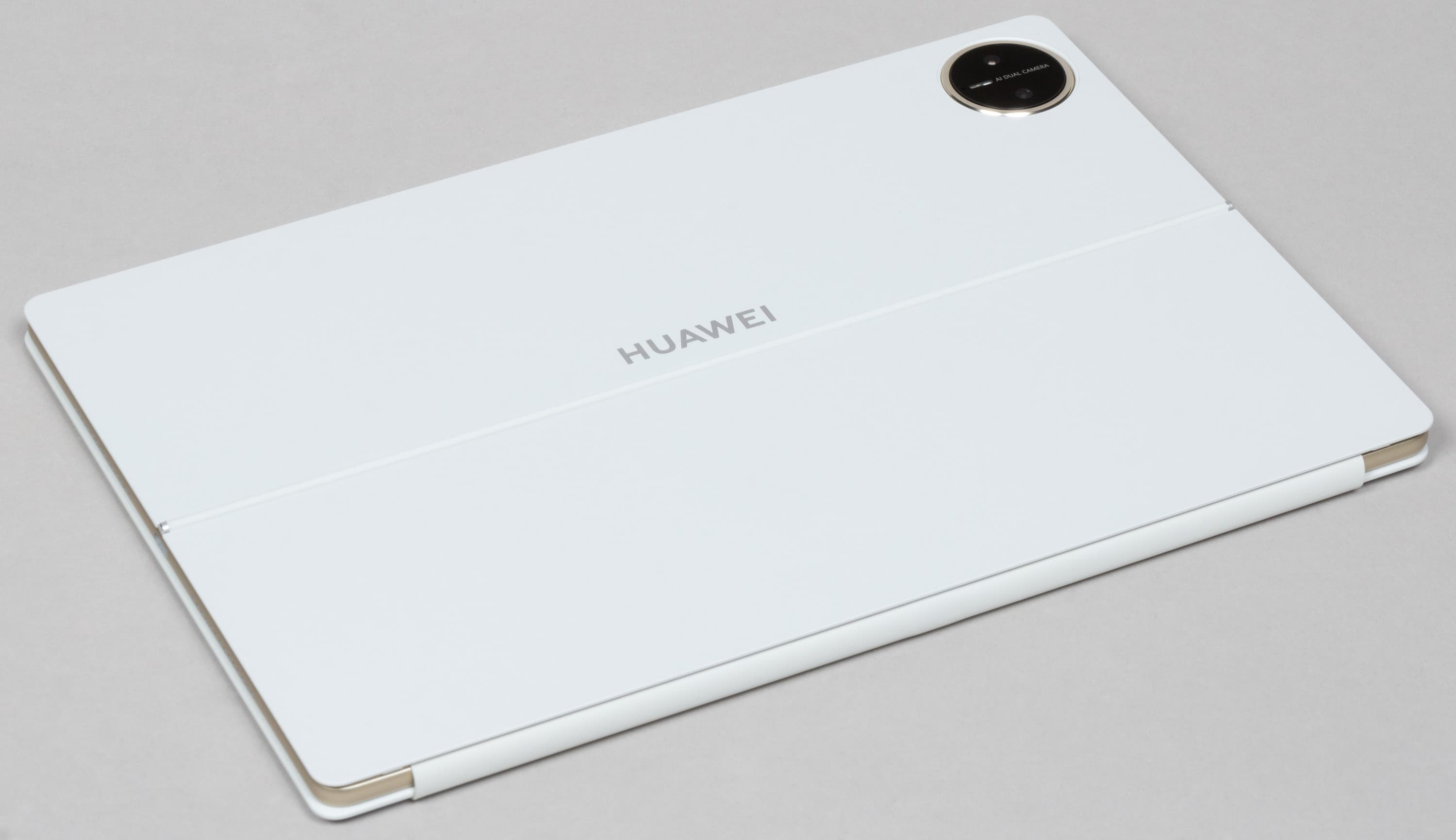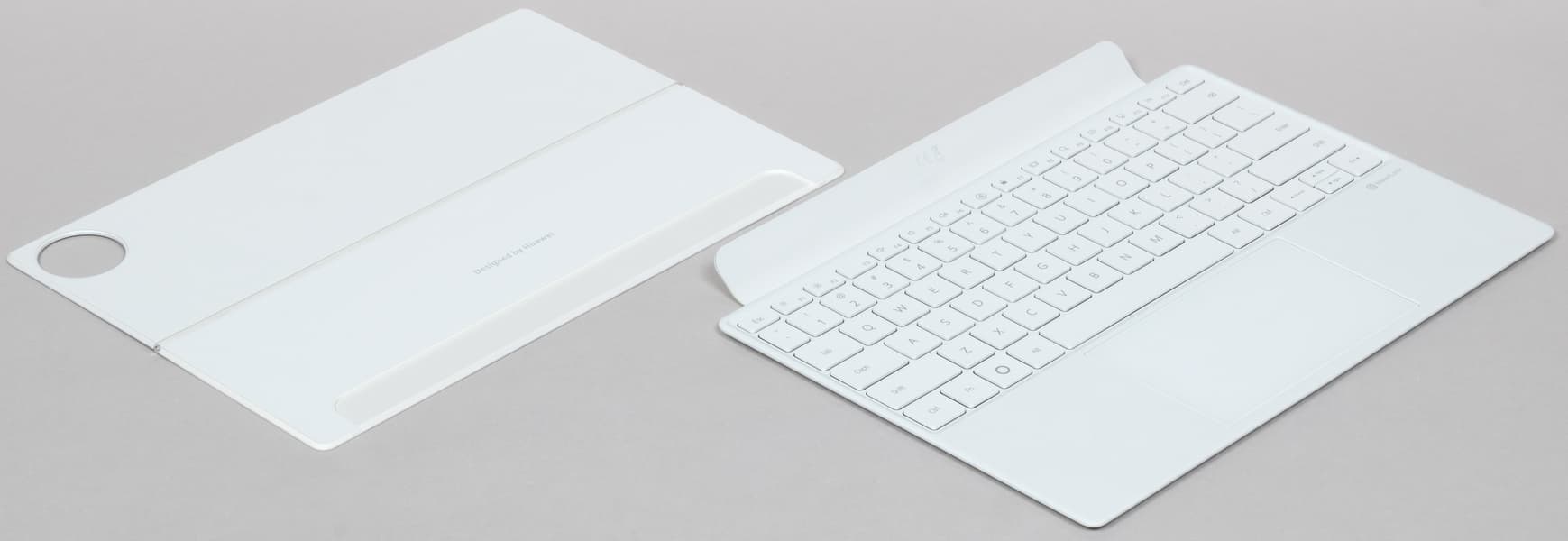 Аналогично модели MatePad Pro 13,2″ прошлого года, обложка-клавиатура разделена на две части — клавиатуру, в закрытом состоянии примыкающую к экрану, и собственно обложку на тыльную сторону. В обзоре вышедшего позже MatePad Pro 12,2″ мы отмечали, что такое решение нам нравится меньше, чем аксессуар в виде единого блока из металла и твердой пластмассы. Но, вероятно, в самом крупном планшете использование такой конструкции представляется нежелательным, поскольку масса целого будет слишком велика.