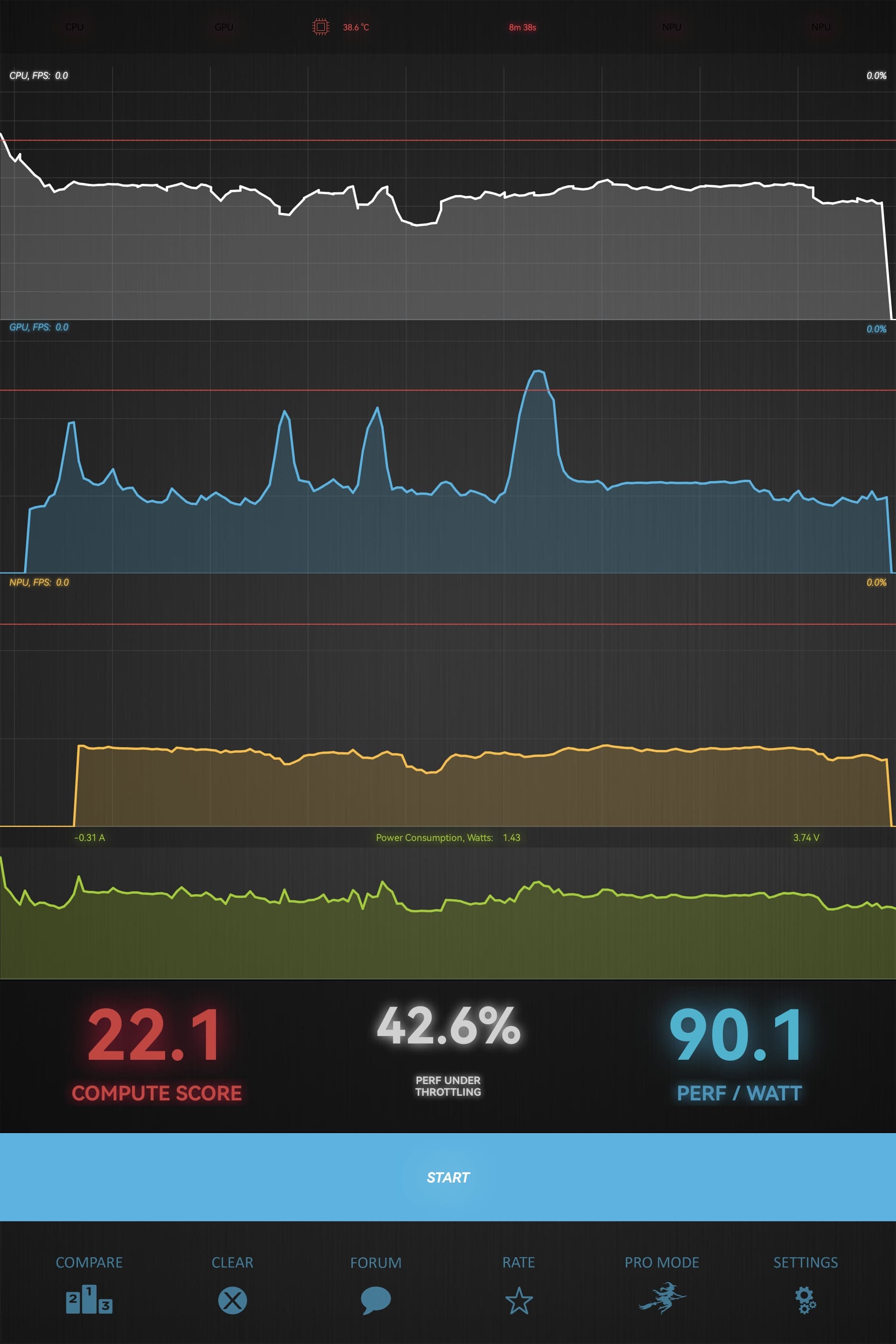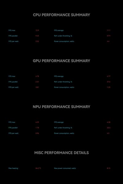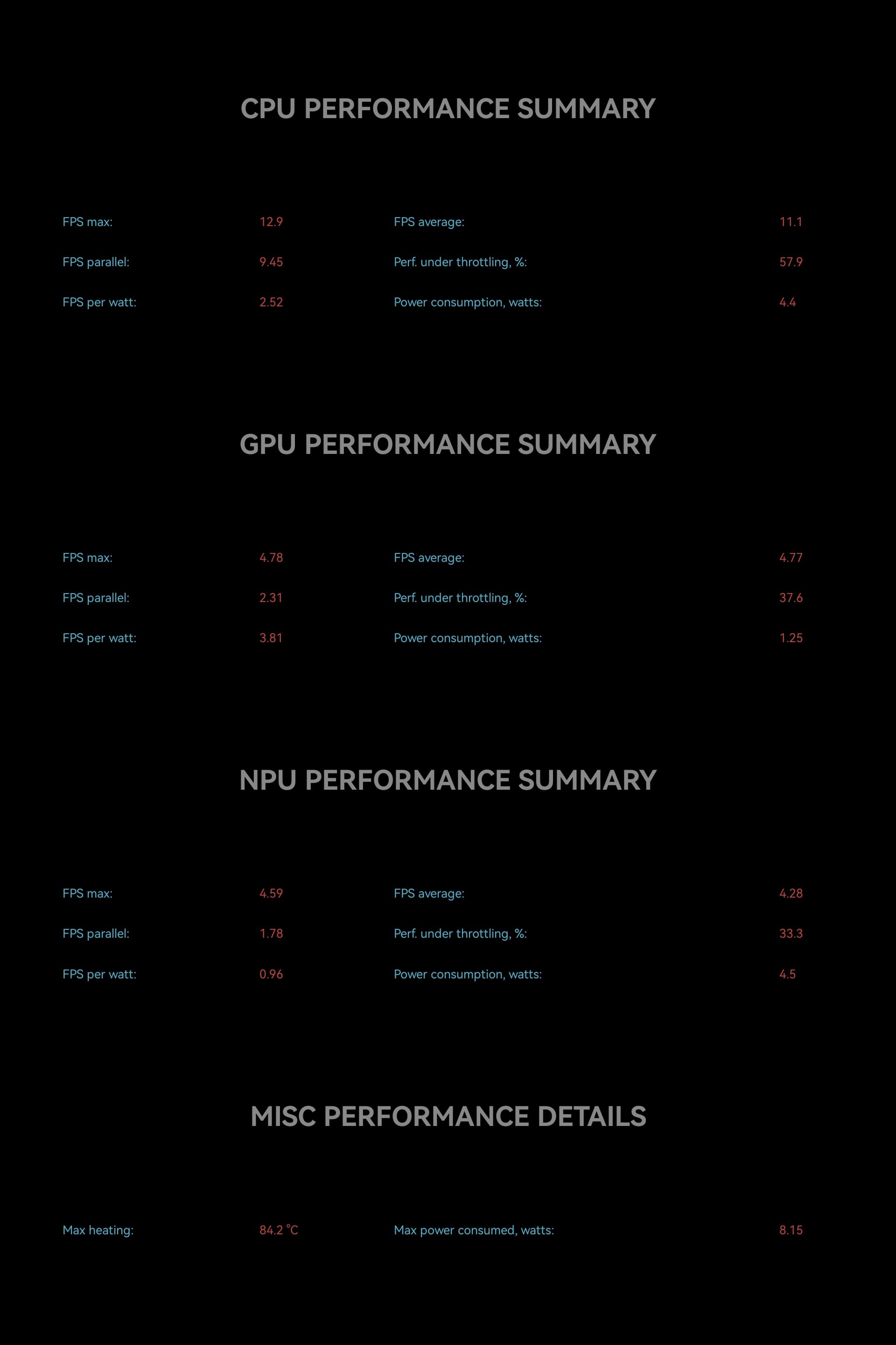 При длительном интенсивном использовании падение производительности может быть очень ощутимым, но всё же не чрезмерным: до 42,6% в среднем, а в наиболее актуальном случае высокой нагрузки на GPU — и вовсе лишь до 37,6%, о чем свидетельствует Burnout Benchmark, нагружающий SoC в течение десяти минут и замеряющий уровень тротлинга.
