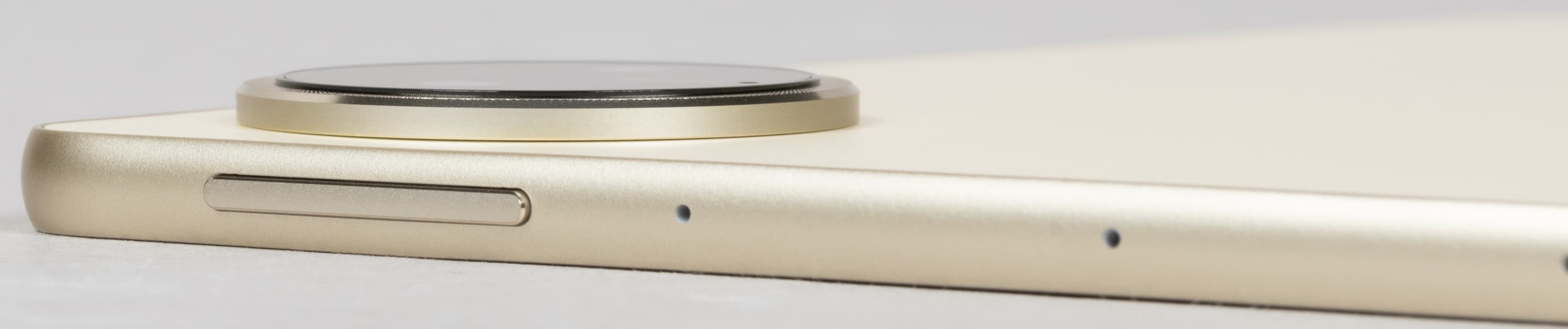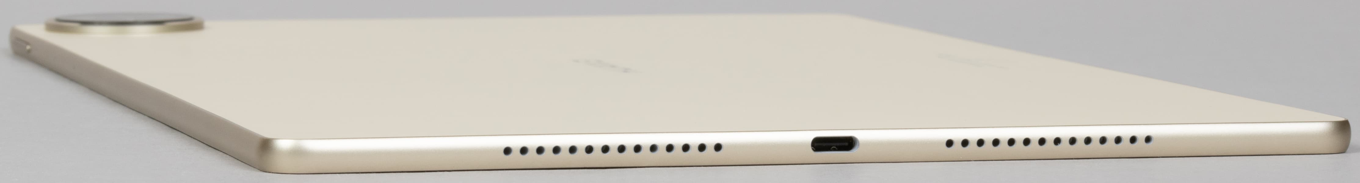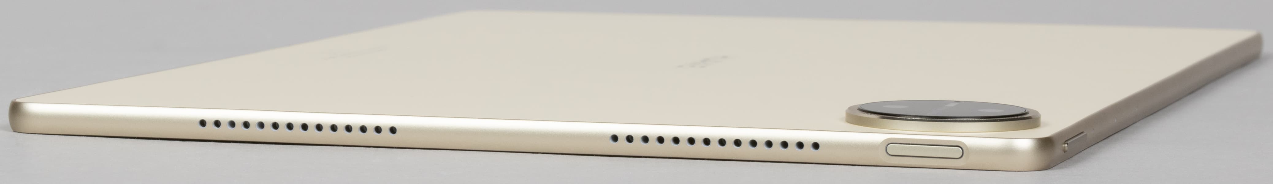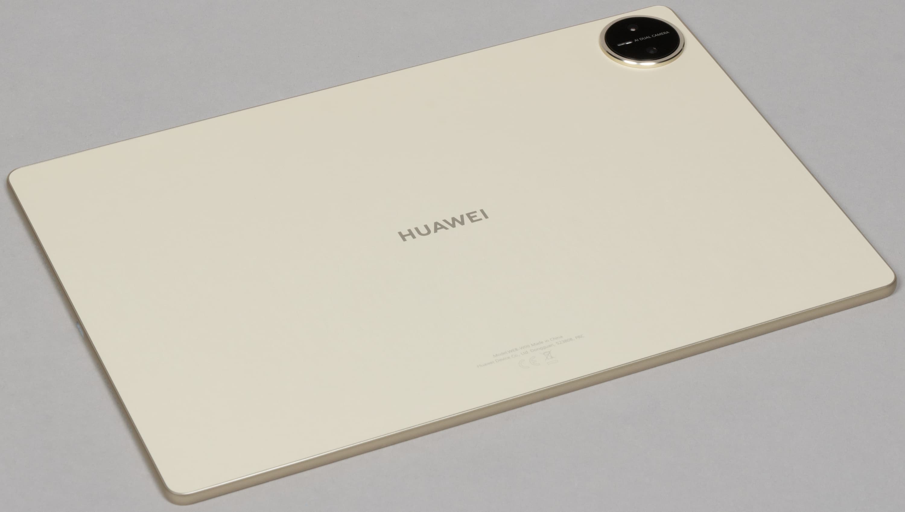 Очень тонкий (всего около 5 мм) корпус имеет скругленные боковины выпуклой формы, однако поскольку они выкрашены под металл, ощущения дешевизны нет. Ну а крышка тыльной стороны выполнена из металла и отличается очень необычным неоднородным цветом. Если смотреть издалека, виден сплошной оттенок (правда, определить его тоже сложно — вроде и желтоватый, но не совсем; это не золотистый, не кремовый и не бежевый цвет, а нечто между ними). Но если приглядеться поближе, то видно, что на поверхности будто проступают некие органические узоры. То же самое мы отмечали и у модели MatePad Pro 12,2″.
