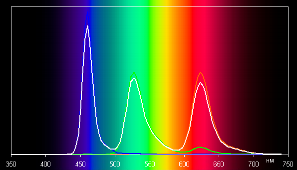 В первом случае спектры компонент (то есть спектры чистых красного, зеленого и синего цветов) очень хорошо разделены: