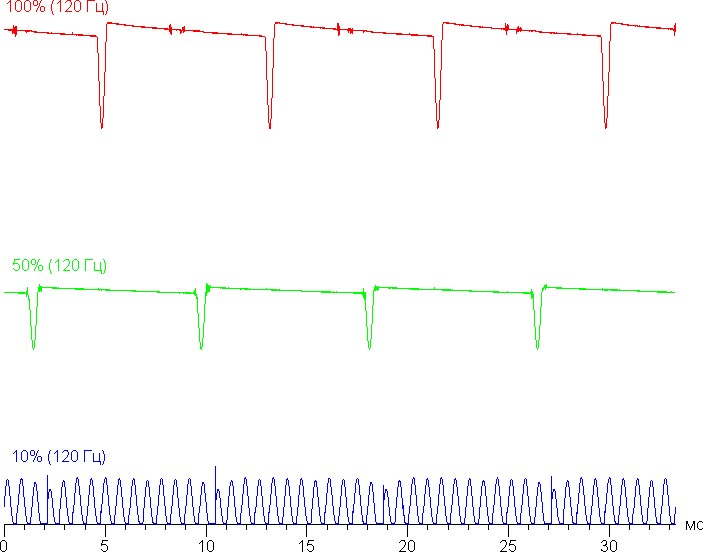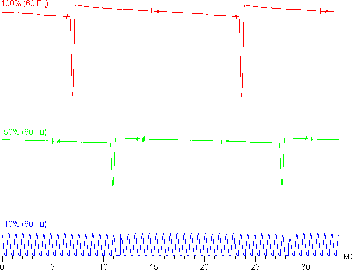 На высоком и среднем уровне яркости присутствует значимая модуляция с частотой примерно 60 или 120 Гц. На рисунках ниже приведены зависимости яркости (вертикальная ось) от времени (горизонтальная ось) для нескольких значений настройки яркости. Сначала для режима с частотой обновления 60 Гц:
