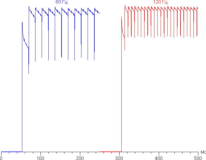 В режиме 120 Гц плавность прокрутки меню с настройками и т. д. заметно повышается. Посмотрим, изменится ли при этом характер модуляции. Режим с частотой обновления 120 Гц: