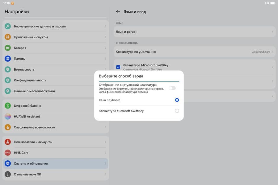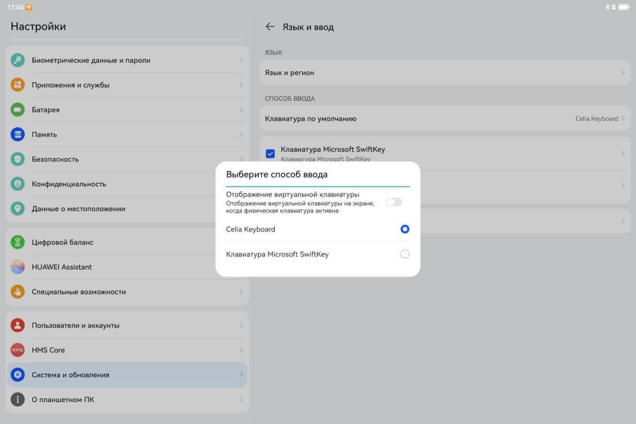 Есть странности и с программными клавиатурами. Для того чтобы «научить» физическую клавиатуру переключаться на русский, надо выбрать Microsoft Swiftkey, а не Celia Keyboard. Если этого не сделать и пользоваться с настройками по умолчанию, то при переключении раскладки на экране будет высвечиваться «Русский», но печататься будут всё равно английские буквы.