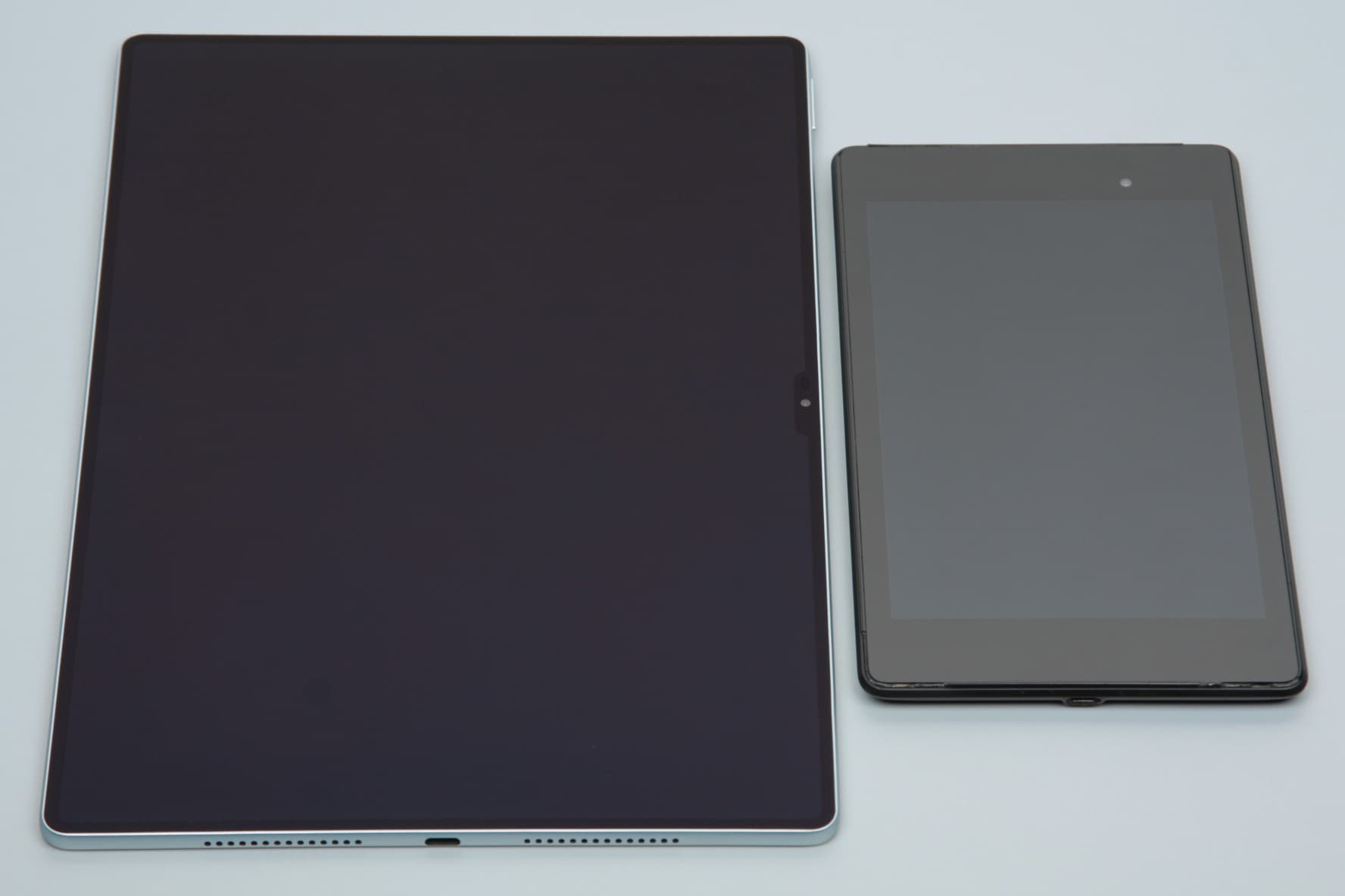 Лицевая поверхность экрана выполнена в виде стеклянной пластины с зеркально-гладкой поверхностью, устойчивой к появлению царапин. Судя по отражению объектов антибликовые свойства экрана гораздо лучше, чем у экрана Google Nexus 7 (2013) (далее просто Nexus 7). Для наглядности приведем фотографию, на которой в выключенных экранах отражается белая поверхность (слева — тестируемый планшет, справа — Nexus 7, далее их можно различать по размеру):