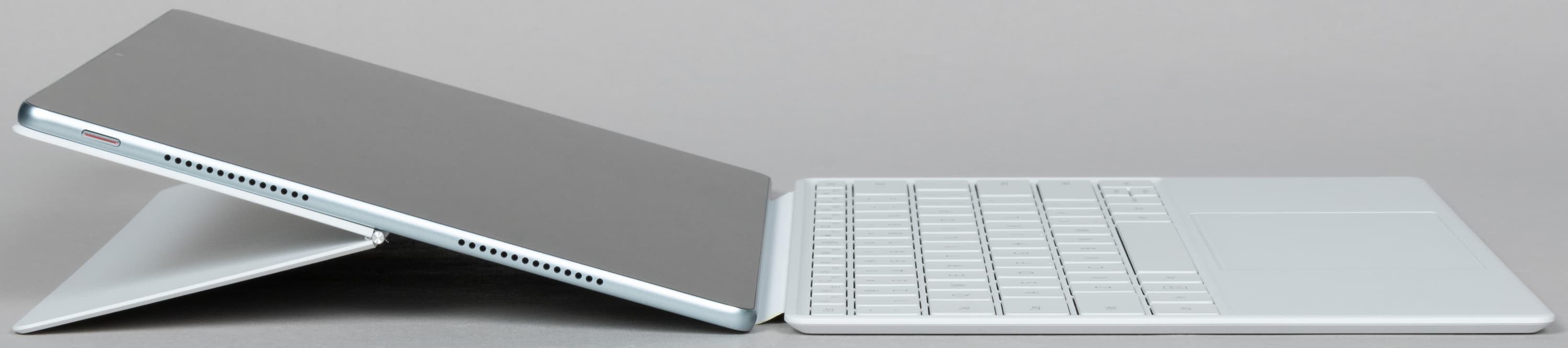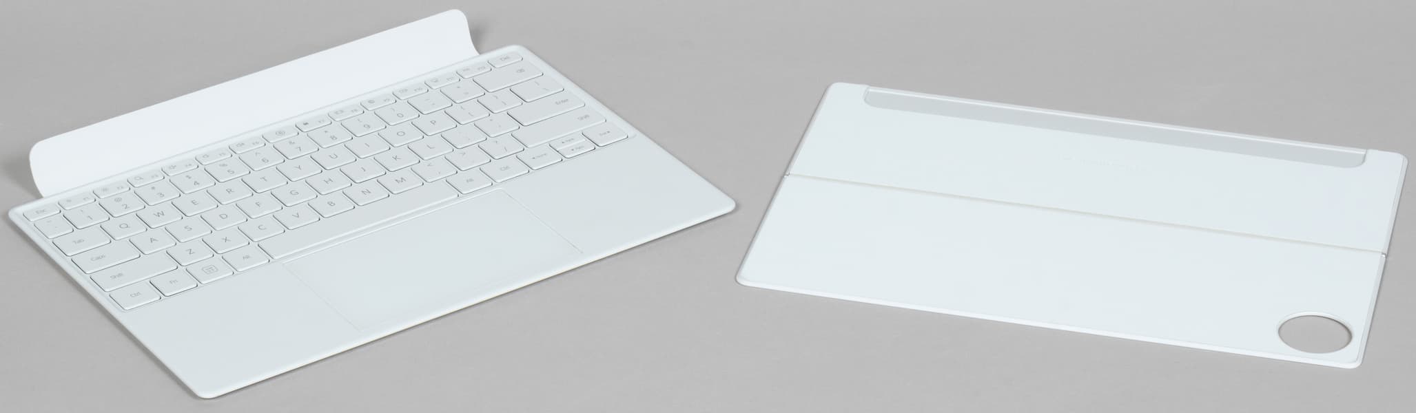 Отличительная особенность данной клавиатуры — наличие тачпада. При прикосновении к нему на экране появляется курсор мыши, и мы можем его использовать примерно так же, как на обычном ноутбуке — при условии, что в приложении это поддерживается (поговорим об этом далее). Клавиатура цепляется к планшету магнитной полоской по большей части длины корпуса. На двух фото ниже хорошо видно, как это происходит.