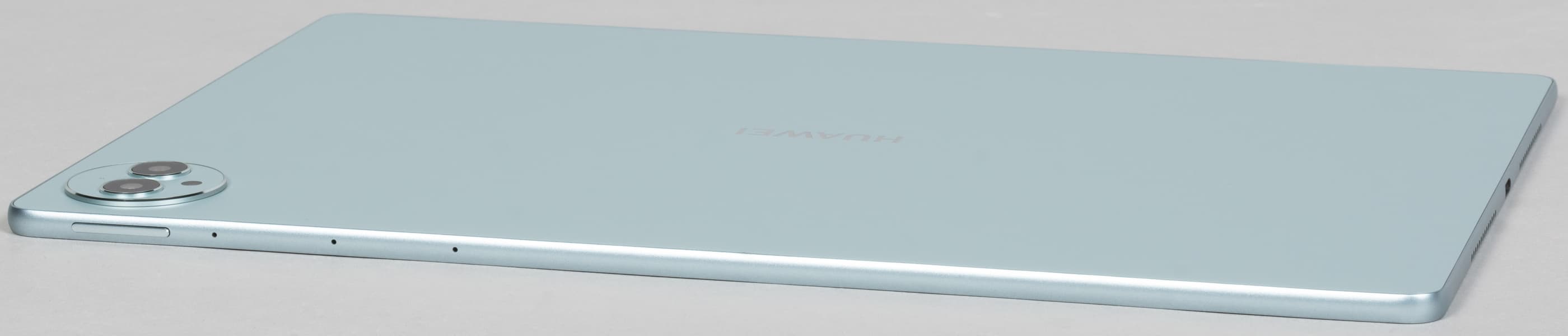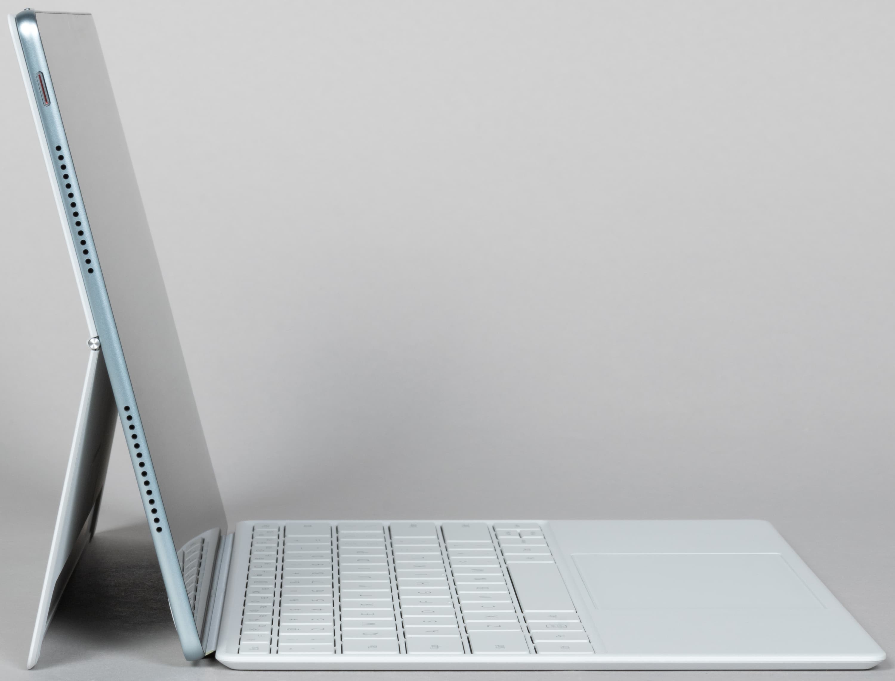 Расположение кнопок, разъемов и прочих элементов традиционно для планшетов Huawei. На верхней грани, рядом с блоком камеры и качелькой регулировки громкости, размещены три отверстия микрофона, что должно обеспечивать хороший прием звука при видеосвязи. Снизу нет вообще ничего, даже коннектора для клавиатуры, так как она крепится иначе (мы продемонстрировали выше, как именно).