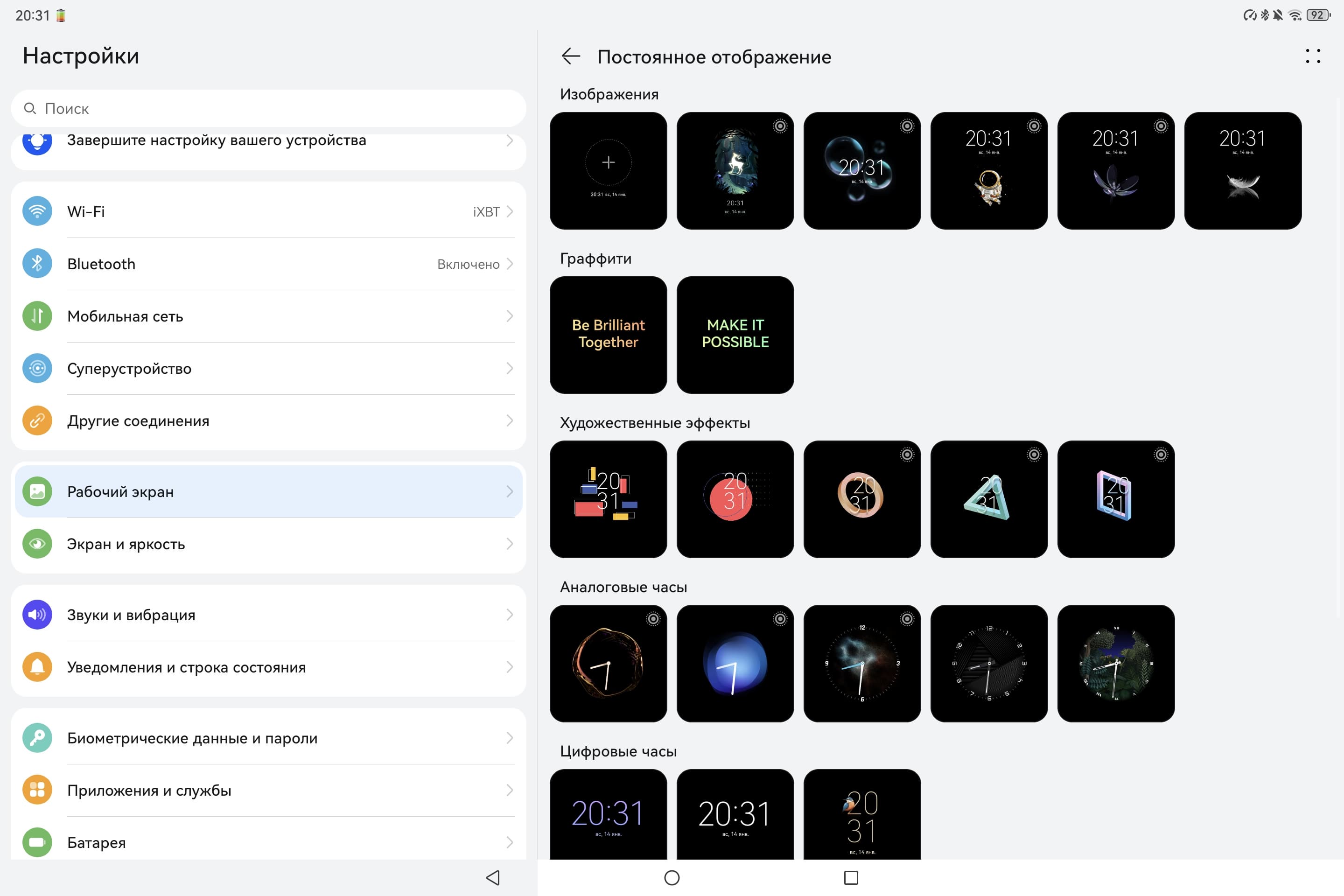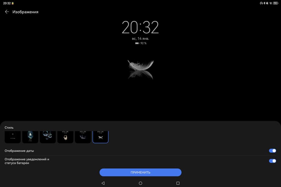 Улучшения косметические, и связаны они прежде всего с интерфейсом и взаимодействием планшета с другими устройствами Huawei. Из наиболее интересного выделим режим экрана AlwaysOn с отображением заставки, который активируется только при взгляде пользователя (видимо, задействуется фронтальная камера) или при касании стекла. А учитывая, что фон на таких заставках всегда темный, батарею это разряжает не очень сильно (напоминаем о свойствах экранов типа OLED — подробнее об этом скажем ниже).