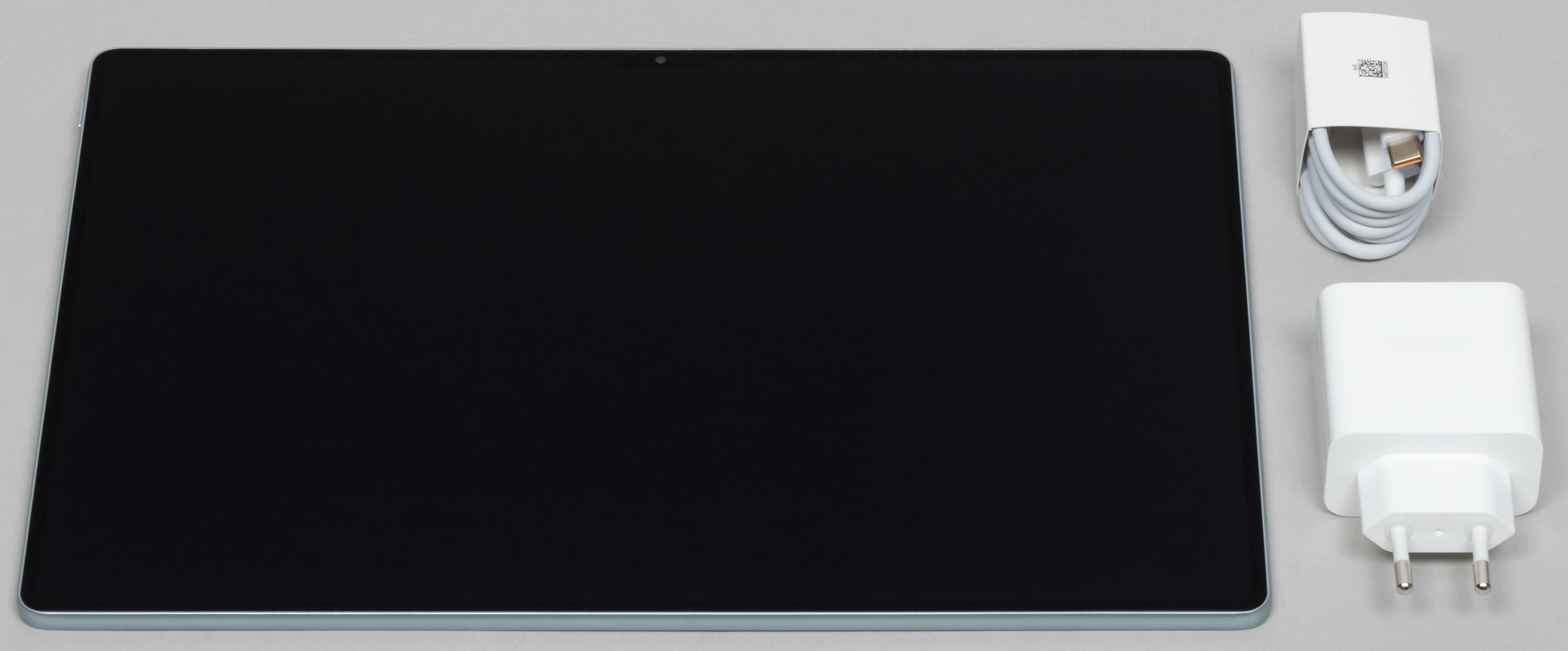 Обратим внимание, что коробка с самим планшетом на этот раз черного цвета, в отличие от коробок других устройств Huawei. Производитель уже одним этим дает понять, что перед нами настоящий флагман. Внутри основного бокса — сам планшет, кабель USB-A — USB-C и зарядный блок. Он заслуживает особого внимания.