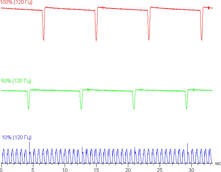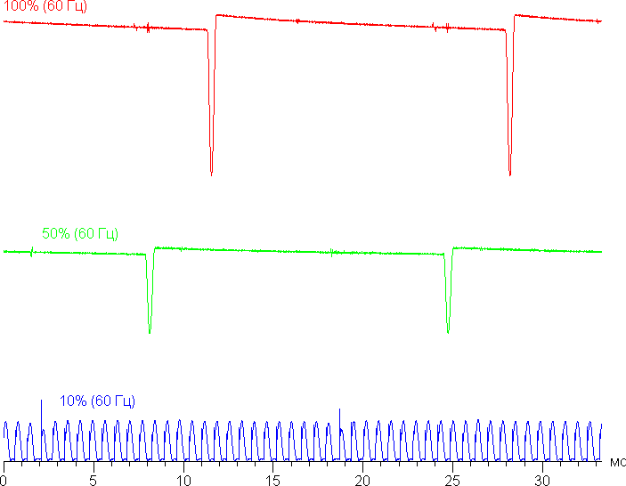 На высоком и среднем уровне яркости присутствует значимая модуляция с частотой примерно 60 или 120 Гц. На рисунках ниже приведены зависимости яркости (вертикальная ось) от времени (горизонтальная ось) для нескольких значений настройки яркости. Сначала для режима с частотой обновления 60 Гц: