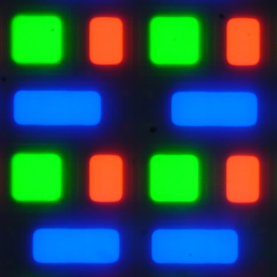 В этом экране используется матрица Flexible OLED — активная матрица на органических светодиодах. Полноцветное изображение создается с помощью субпикселей трех цветов — красного (R), зеленого (G) и синего (B) в равном количестве. Это подтверждается фрагментом микрофотографии: