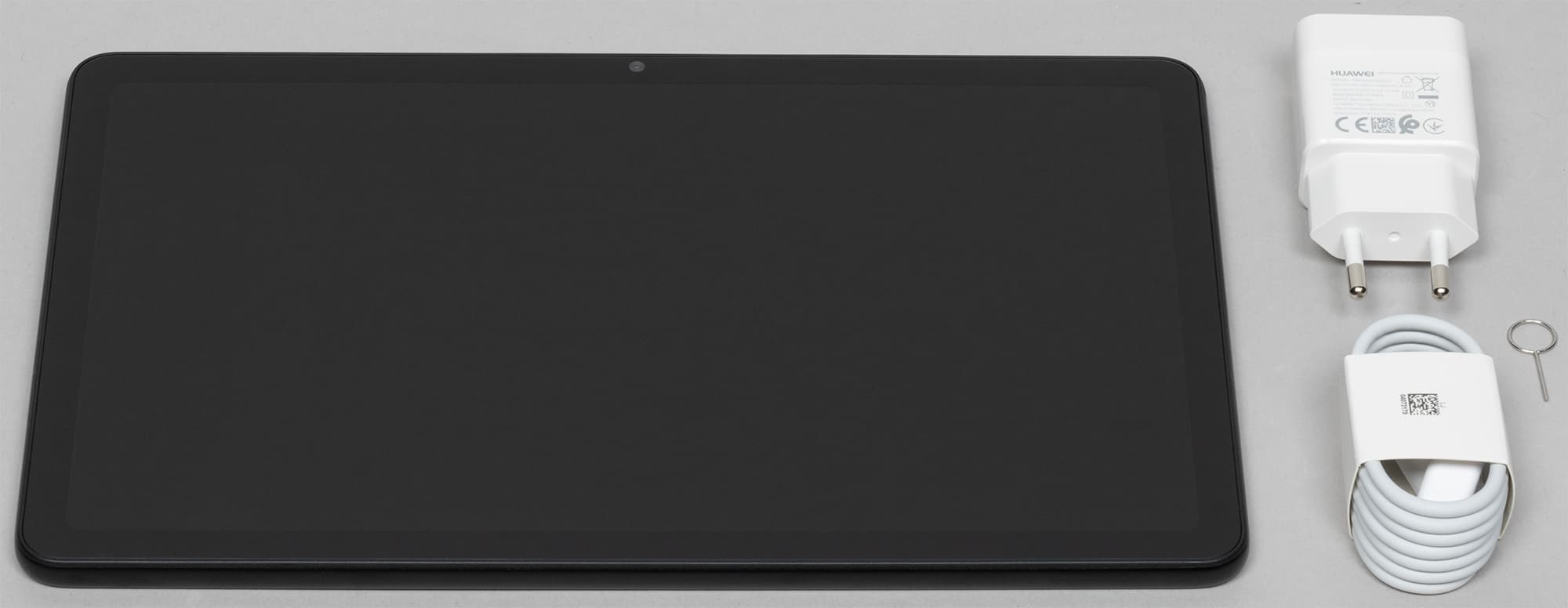 Внутри бокса планшет располагается на мини-коробках, в которых зарядное устройство 5 В 2 А и кабель USB-C. Кроме того, на поверхности одной из коробочек приколот ключик для извлечения слота с SIM-картой и картой памяти.