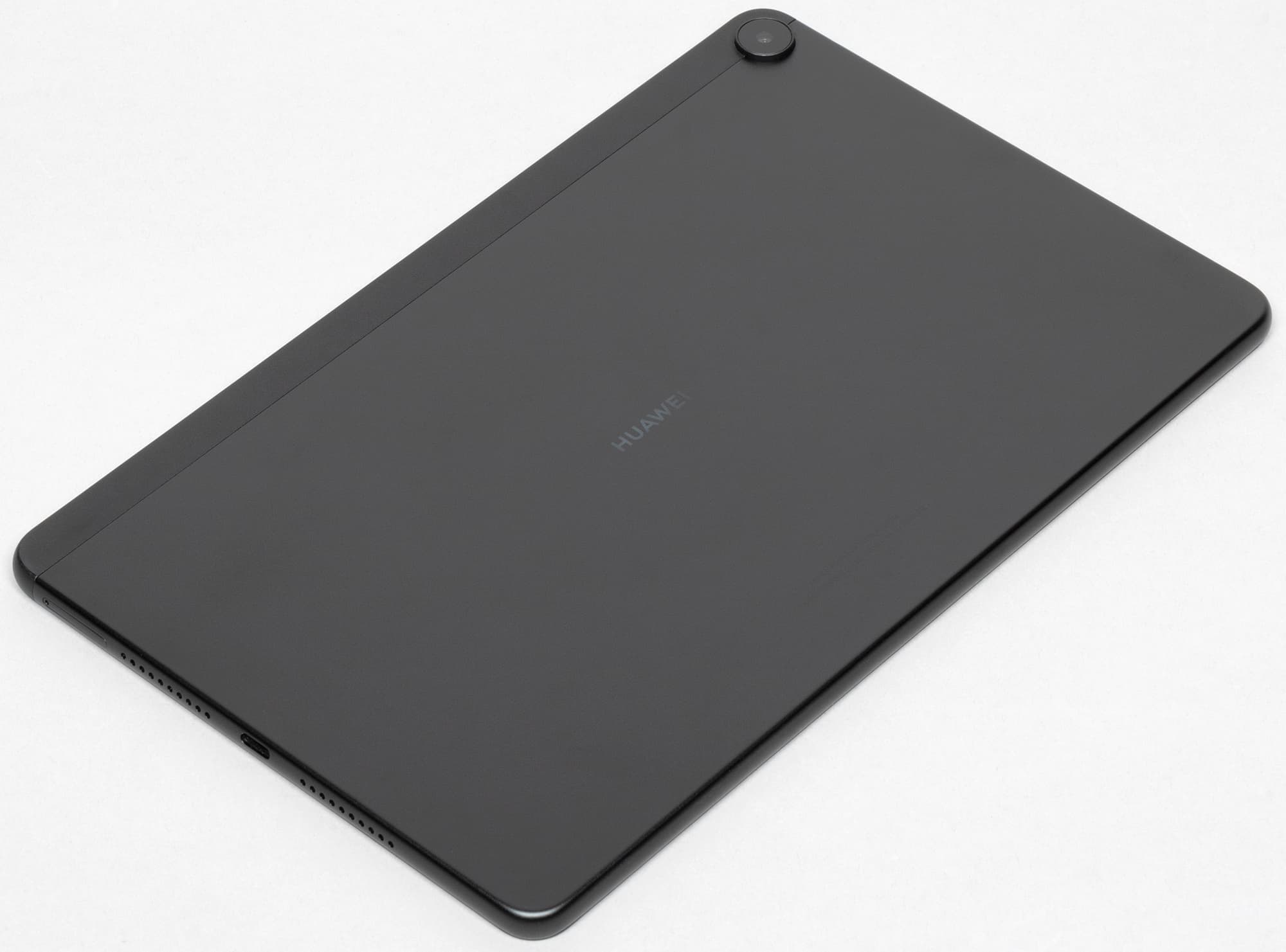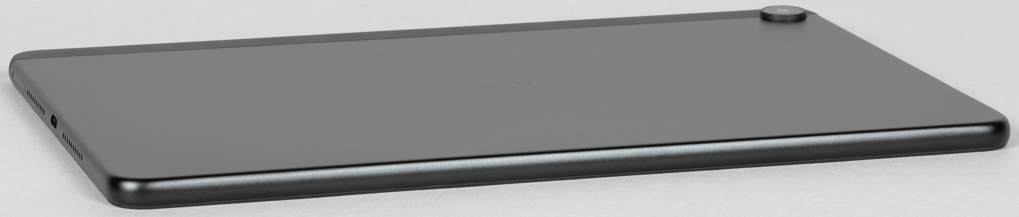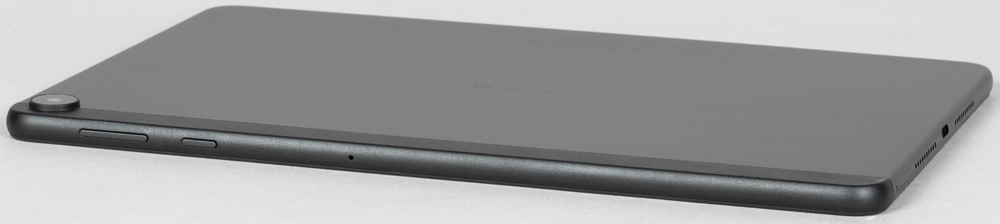 Расположение разъемов и слотов стандартное. На правой грани — USB-C (увы, USB здесь только 2.0, а не 3.1, как у флагмана, но, пожалуй, для обычного домашнего пользователя это не так уж важно) и слот для SIM-карт и microSD. Интересно, что USB-C сдвинут относительно продольной оси.