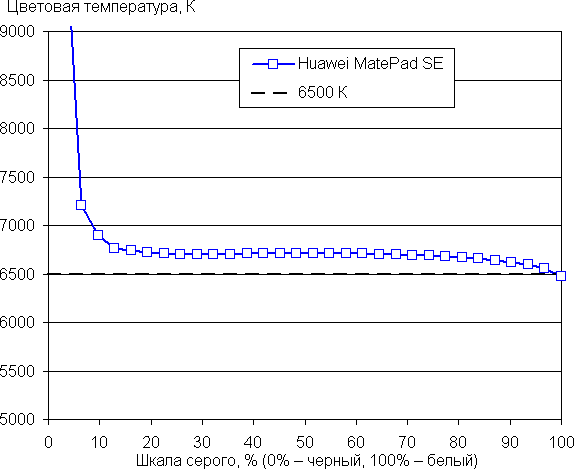 По умолчанию баланс оттенков на шкале серого хороший, так как цветовая температура близка к стандартным 6500 К, и отклонение от спектра абсолютно черного тела (ΔE) меньше 10, что для потребительского устройства считается приемлемым показателем. При этом цветовая температура и ΔE мало изменяются от оттенка к оттенку — это положительно сказывается на визуальной оценке цветового баланса. (Самые темные области шкалы серого можно не учитывать, так как там баланс цветов не имеет большого значения, да и погрешность измерений цветовых характеристик на низкой яркости большая.)