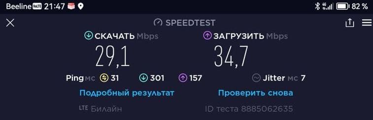Устройство не поддерживает Wi-Fi 6, только Wi-Fi 5 (802.11ac), нет и поддержки 5G (впрочем, для России она не особо актуальна). Ниже — тест скорости в LTE, проведенный с помощью браузерной версии Speedtest.net.