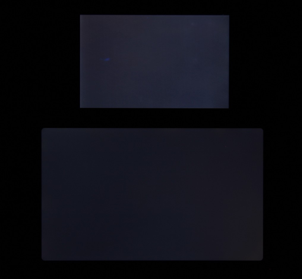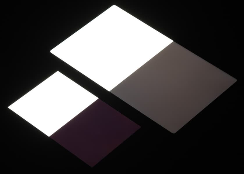 Яркость под углом у экранов уменьшилась (как минимум в 5 раз, исходя из разницы в выдержке), и снизилась примерно одинаково. Черное поле при отклонении по диагонали сильно высветляется, но остается условно нейтрально-серым (так это воспринимают глаза). Фотографии ниже это демонстрируют (яркость белых участков в перпендикулярном плоскости экранов направлении одинаковая!):