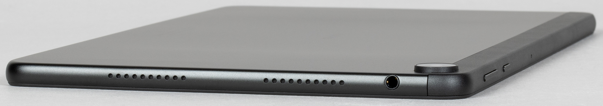 Все кнопки расположены на верхней грани: качелька регулировки громкости и «Питание». Ну а снизу у планшета вовсе ничего нет. Кстати, обратим внимание, что отсутствует и коннектор для обложки-клавиатуры.
