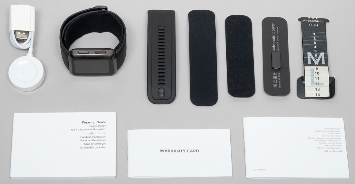 Это половинка силиконового ремешка альтернативной длины (M, тогда как на часах изначально ремешок L), манжета альтернативной длины, сменные текстильные чехлы обоих размеров на манжету (производитель рекомендует их регулярно чистить, а со временем — менять, «переодевая» манжету), стальная застежка для прикрепления манжеты к часам, бумажный измеритель толщины руки. Кроме этого, в коробке располагается маленький буклет «Краткое руководство пользователя», гарантийный талон, отдельный буклет с разъяснениями, как прикреплять манжету к ремешку и к часам (все это очень неочевидно) и беспроводная зарядка с USB-А на конце провода.
