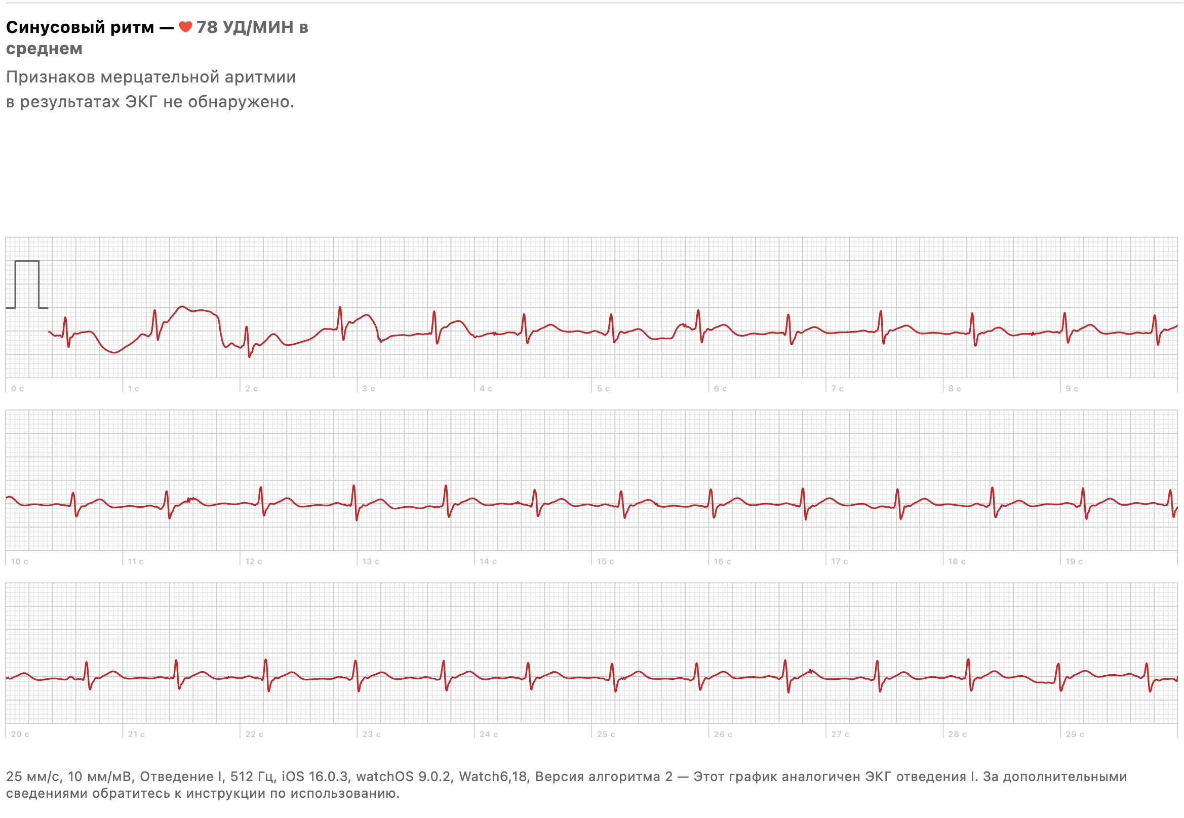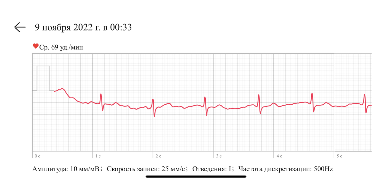 Кроме того, здесь есть измерение ЭКГ. Чтобы сделать анализ, надо запустить соответствующее приложение в часах и прикоснуться пальцем к кнопке Health. Вот результат.