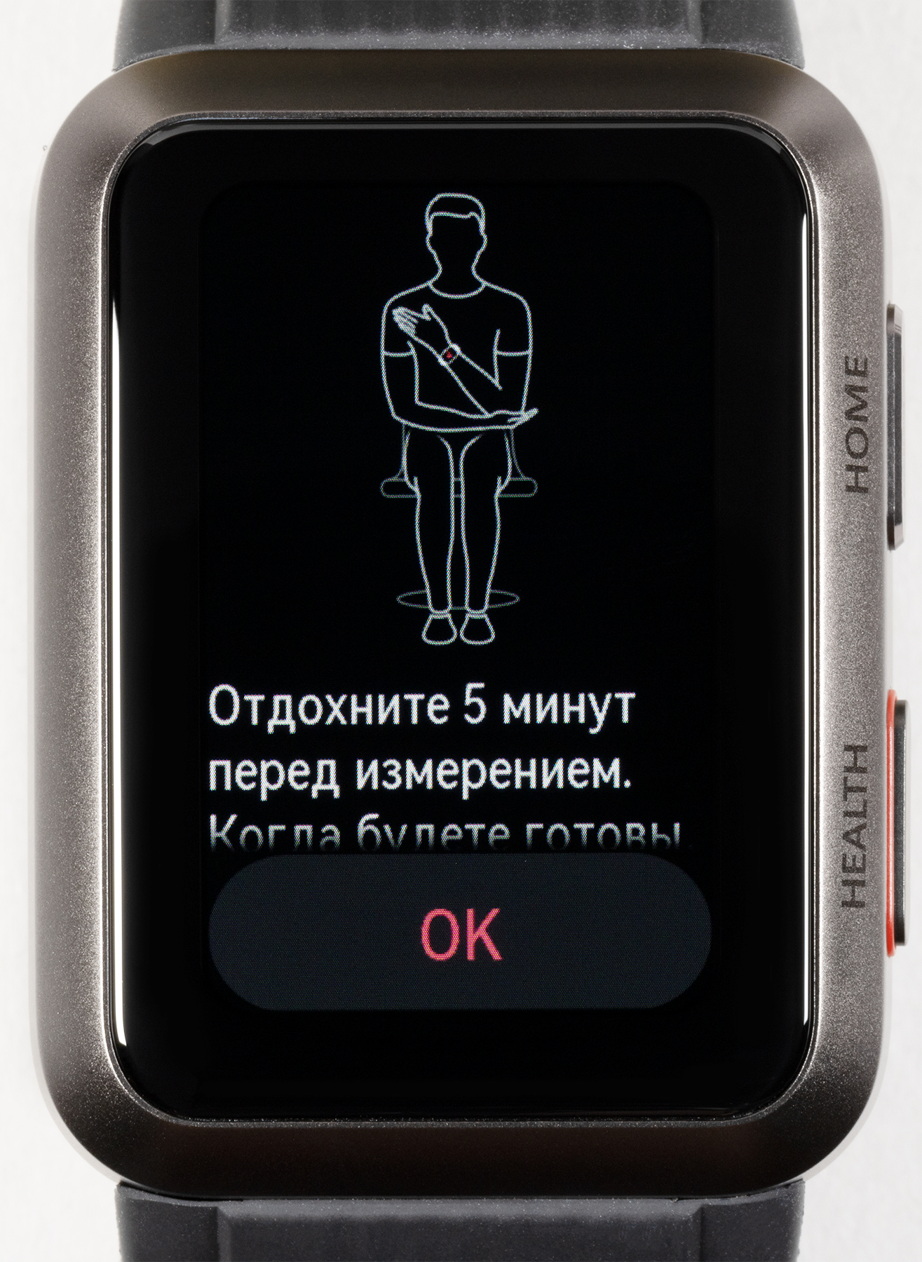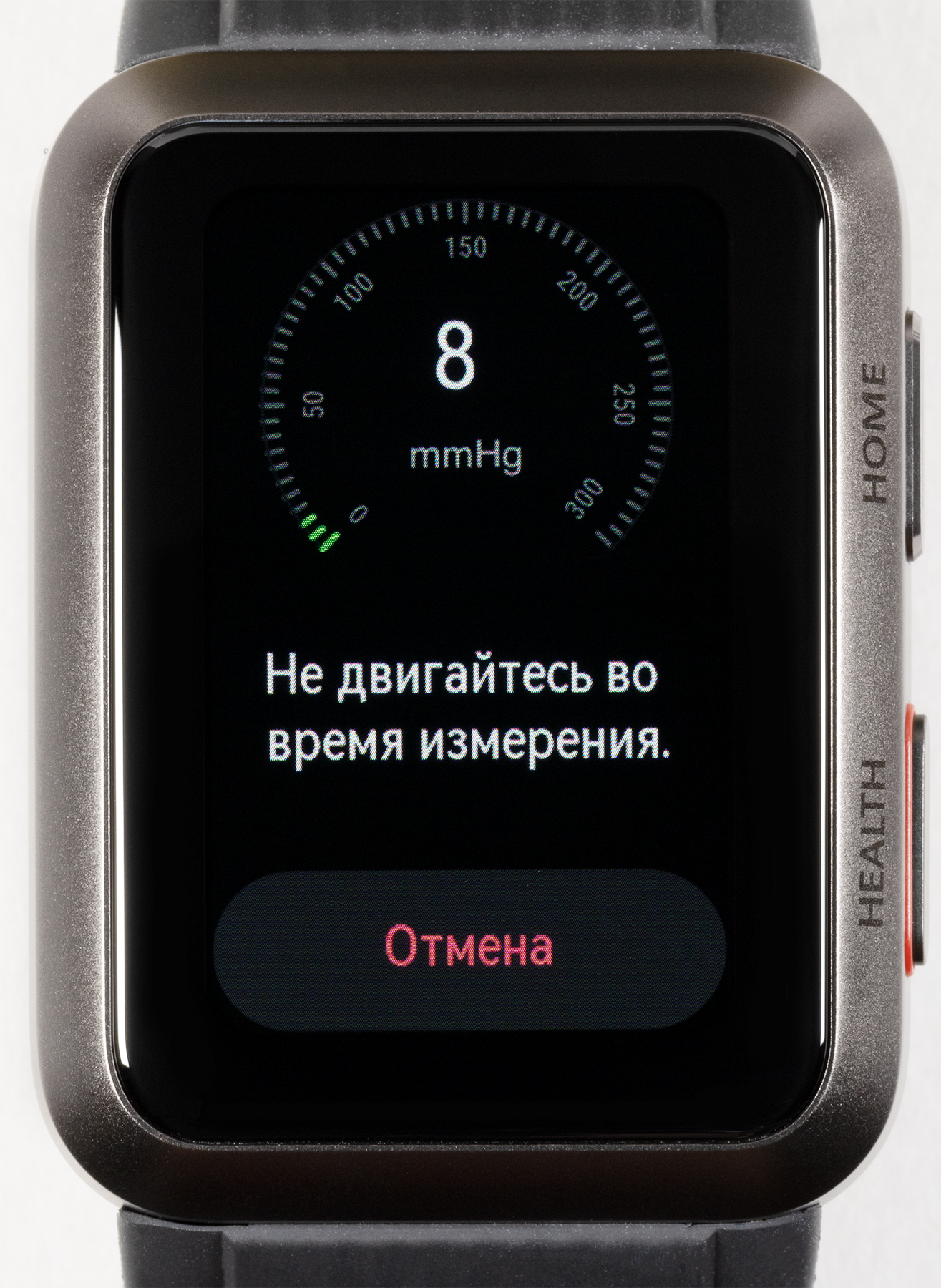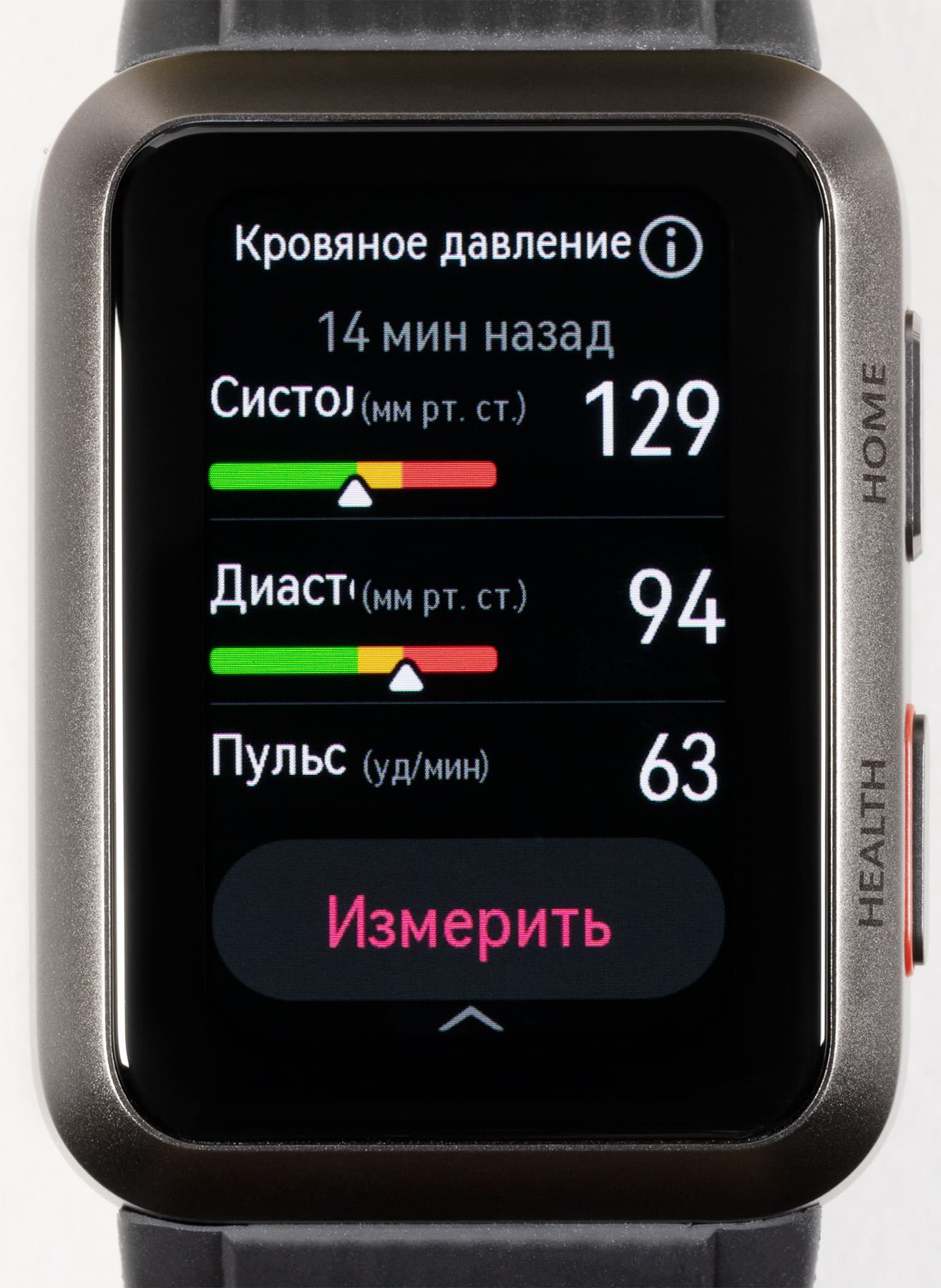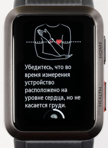 Мы неоднократно протестировали эту опцию на часах и сравнили результаты с показателями медицинского тонометра. Итак, чтобы запустить процесс, надо нажать на кнопку Health, выбрать «Измерить», после чего поднять руку на уровень сердца и, не прижимая ее к телу, по возможности расслабить (полностью это не получится, потому что руку-то приходится держать на весу).