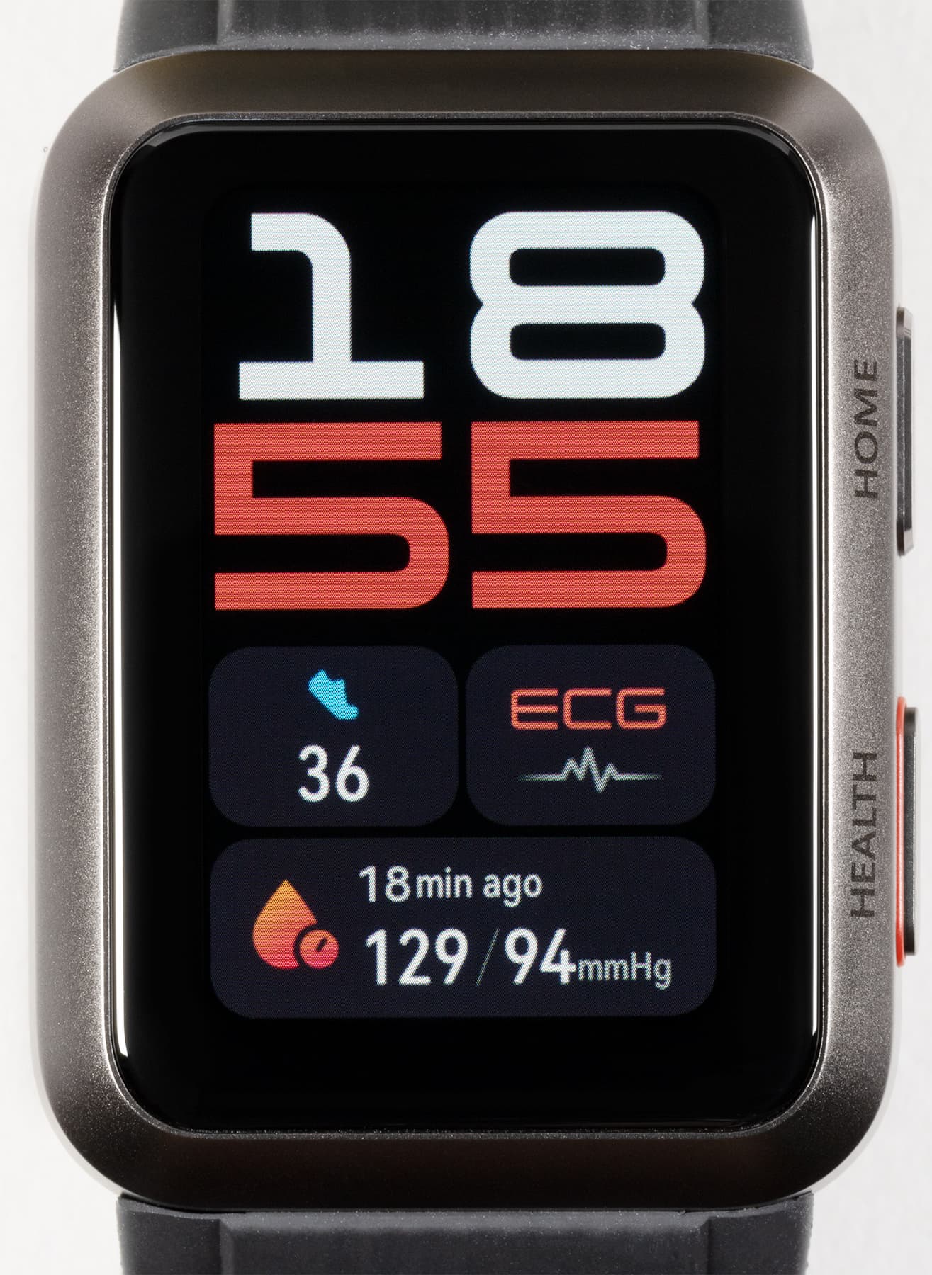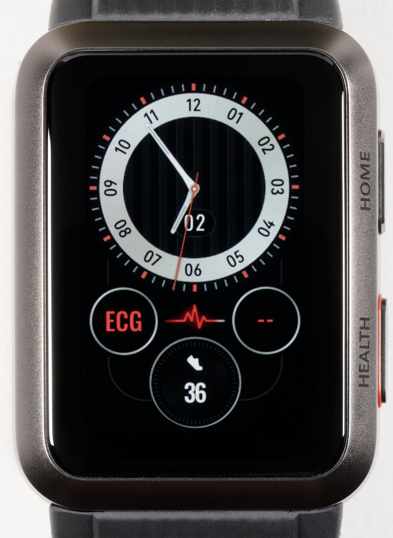 Бо́льшая часть корпуса выполнена из алюминия. Металлические здесь и обе кнопки, расположенные на правой грани. Одна — «Домой», другая же — «Здоровье» — запускает приложение для измерения кровяного давления, а еще используется при измерении ЭКГ (к ней надо прикладывать палец).