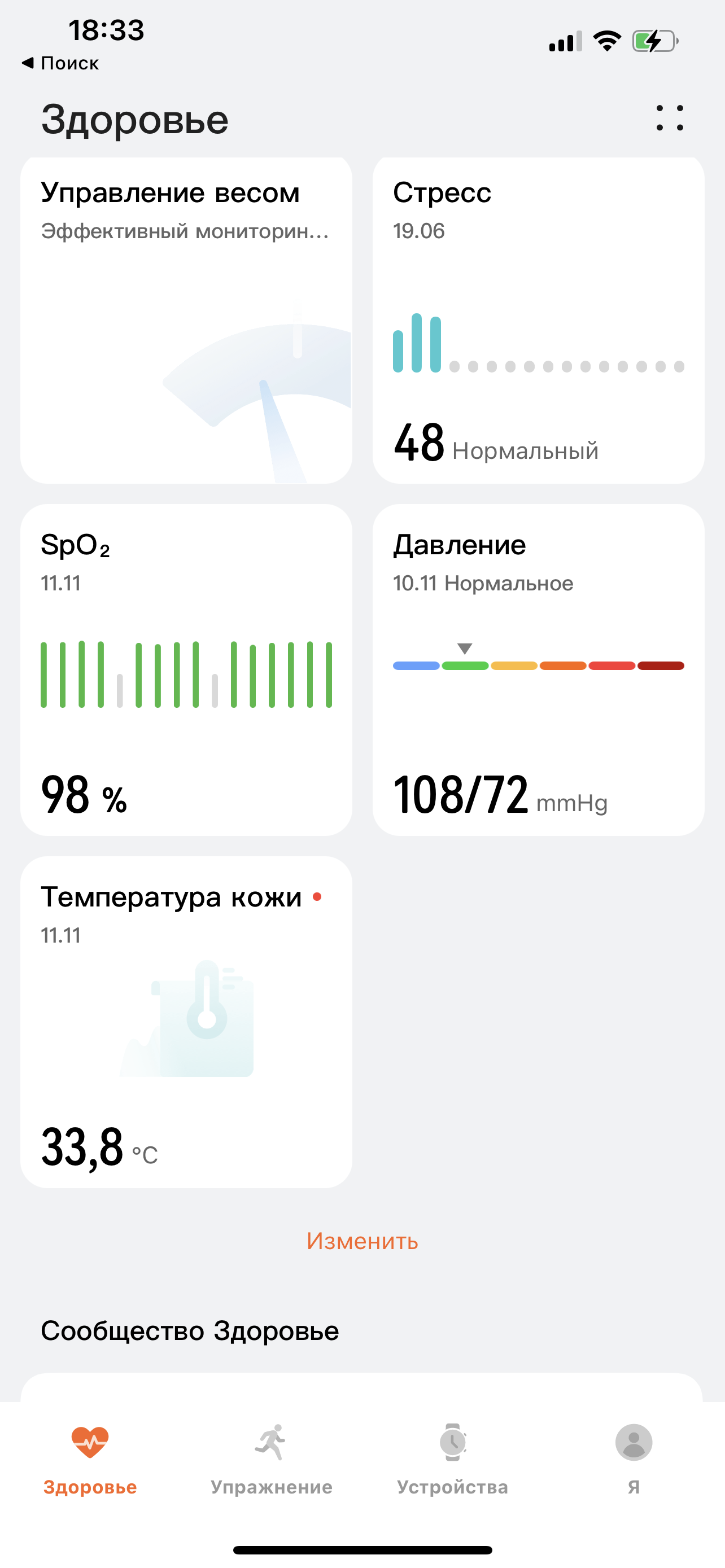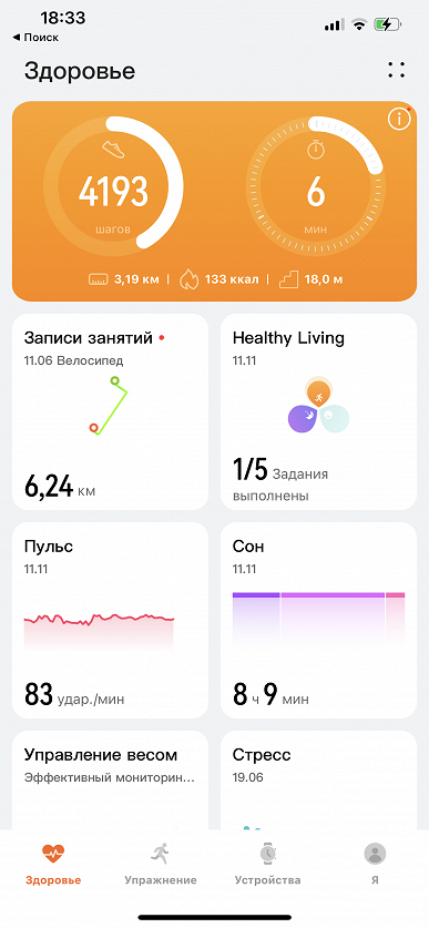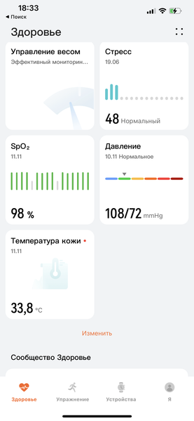 На скриншоте выше видно, что есть карточки «Давление», «Температура кожи», «SpO2». Все данные туда поступают именно от часов, но если температура кожи с количество кислорода в крови определяются автоматически, как, разумеется, и пульс, давление измеряется только по команде пользователя. Оно и понятно, ведь измерение происходит таким же образом, как со стандартным медицинским тонометром — с той только разницей, что надувающаяся манжета расположена не выше локтя, а на запястье.