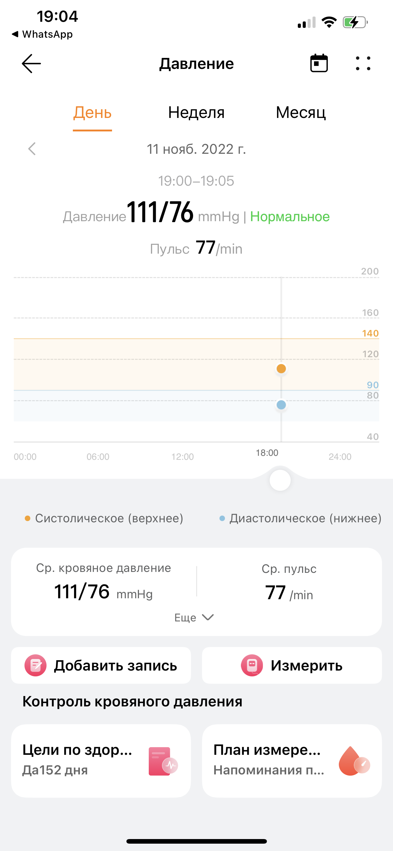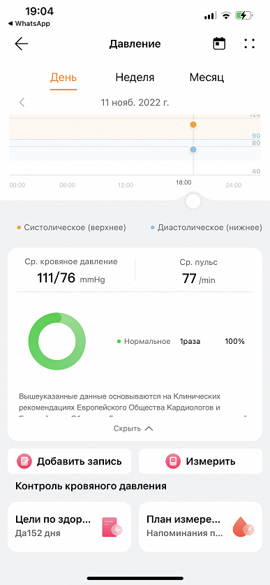 Результат показывается на экране и тут же отправляется на часы в приложение Huawei Здоровье (причем, на смартфон приходит уведомление: «Доступна новая запись кровяного давления». Ну, собственно, ничего нового мы здесь не увидим по сравнению с тем, что показывают сами часы, но зато в приложении собираются данные всех ваших измерений. Кстати, часы можно надеть и на другого человека и измерить давление ему — там есть опция гостевого измерения (отличие лишь в том, что эти данные не отправляются в приложение, только показываются на экране часов).