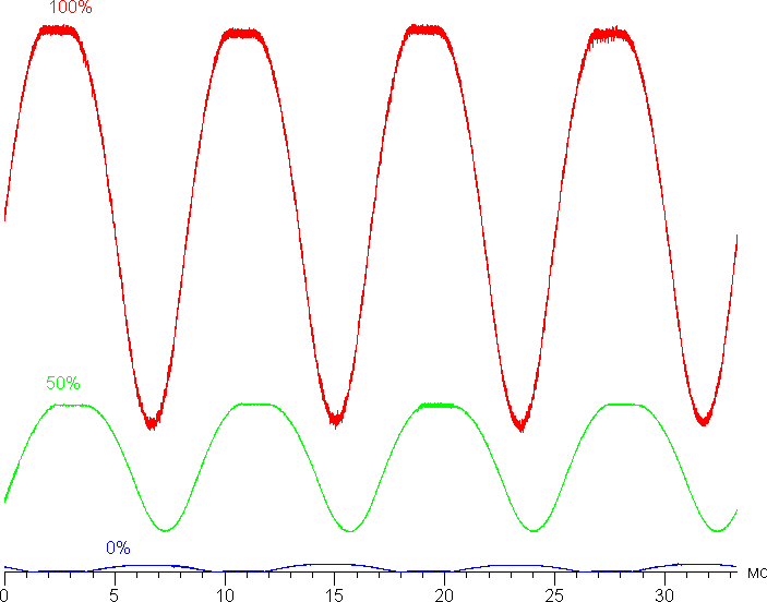 На графике зависимости яркости от времени определяется значимая модуляция с частотой 120 Гц, а при желании на некоторых изображениях при быстром движении часов относительно глаз можно выявить стробоскопических эффект. Однако по факту при обычном использовании мерцание не обнаруживается, так как фаза модуляции различается по площади экрана. На рисунке ниже приведены зависимости яркости (вертикальная ось) от времени (горизонтальная ось) для нескольких значений настройки яркости.