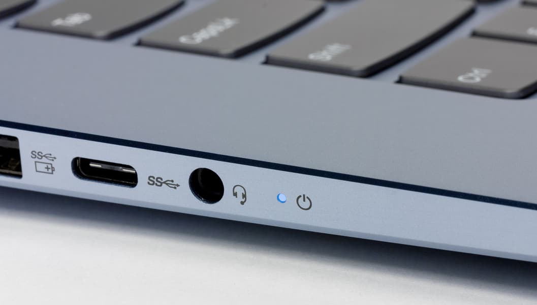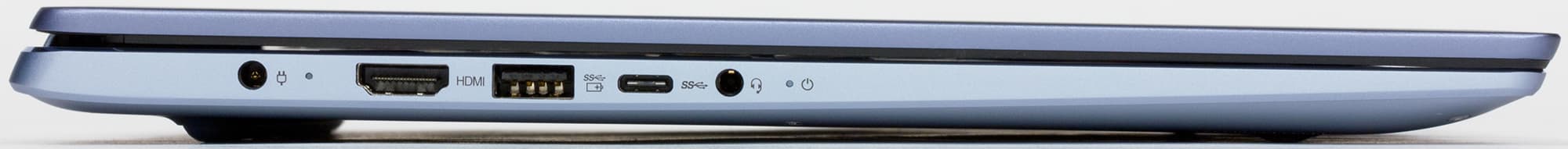 Разумеется, такая конструкция крепления крышки не оставляет возможности разместить интерфейсные разъемы на задней панели (вообще говоря, задней панели как таковой здесь просто нет), они вынесены на бока. Впрочем, разъемов этих не так уж много. Слева расположились разъем питания под фирменный круглый в сечении штекер, видеовыход HDMI, USB 3.0 Type-A (с поддержкой зарядки устройств даже при выключенном ноутбуке), USB 3.0 Type-C и комбинированный миниджек для подключения гарнитуры.