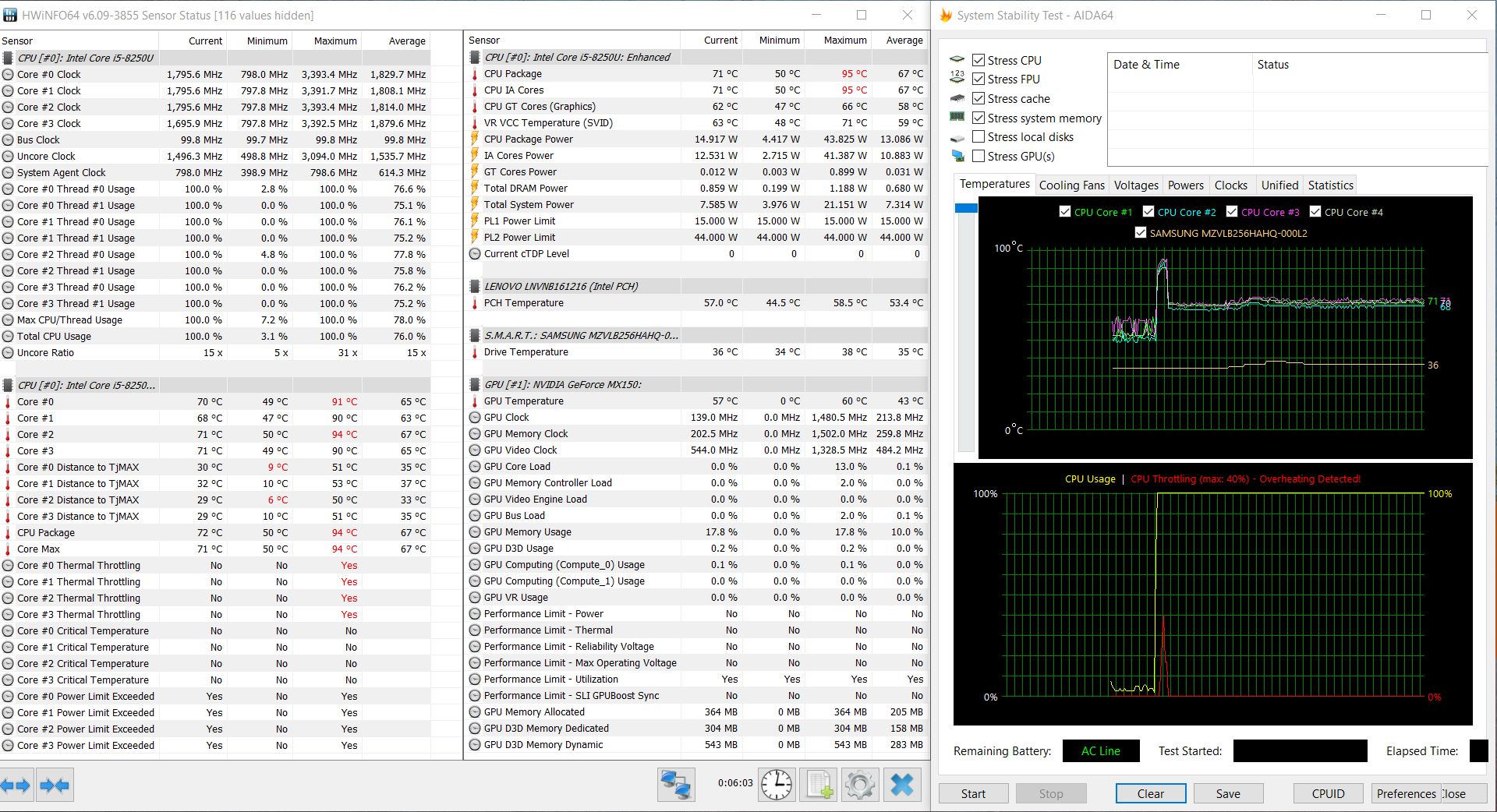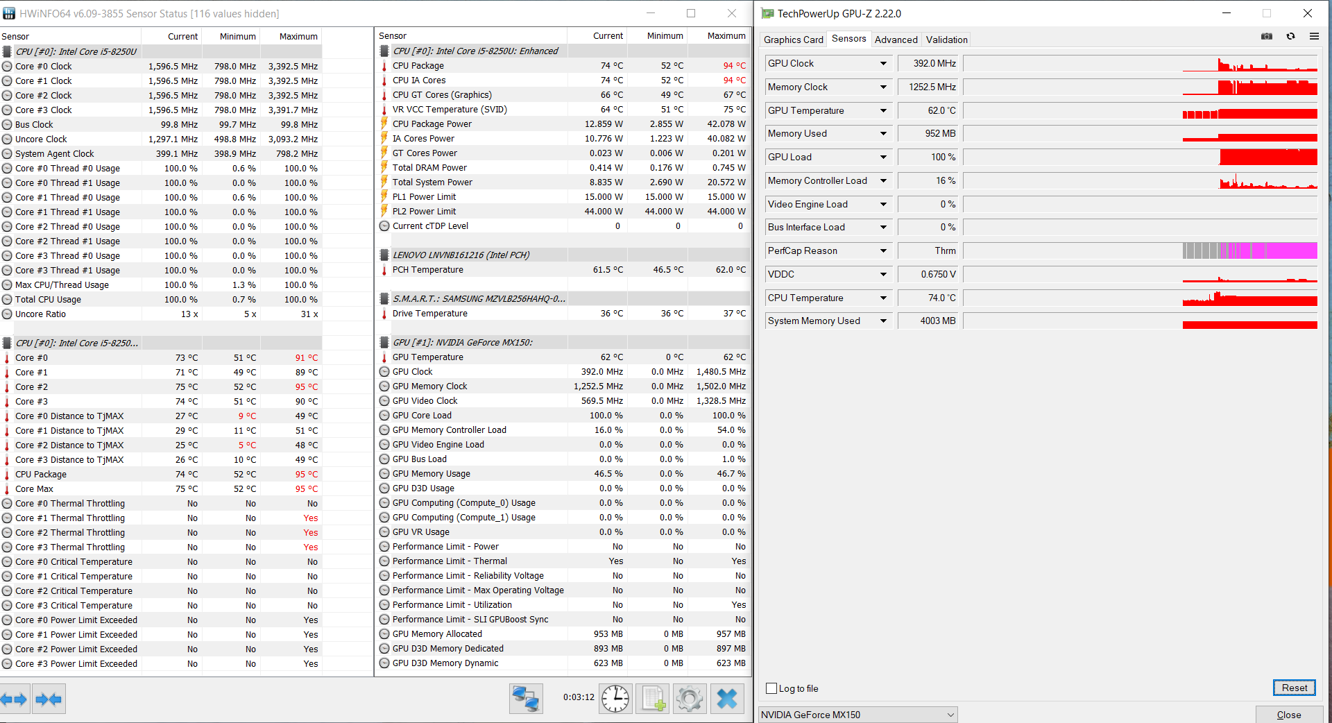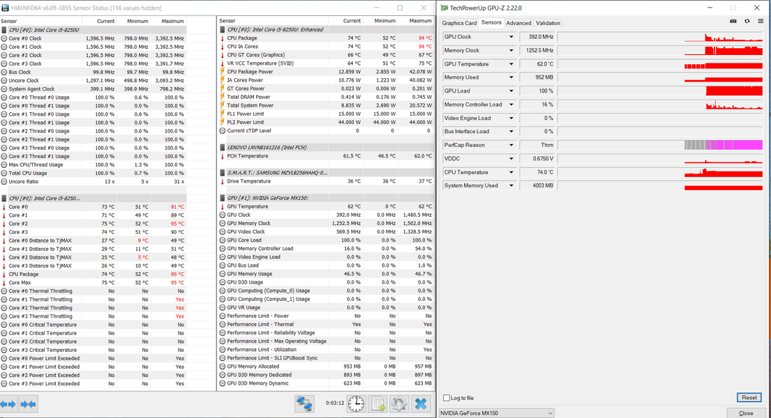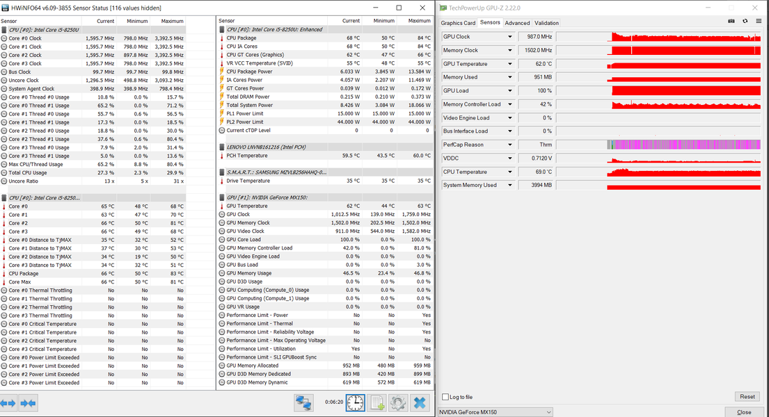 При чисто синтетической максимальной нагрузке на видеоускоритель (без загрузки процессора) потребление процессора составляет около 6 Вт, частота ядер снижена до 1,6 ГГц, их температура находится в районе 65-68 градусов. Видеокарта GeForce MX150 поднимает частоту ядра до 1,75 ГГц, но в таком режиме карточка работает лишь считанные секунды, дальше частота GPU опускается примерно до 1 ГГц (некоторое время она пытается подниматься до 1,2 ГГц), память всегда работает на 1,5 ГГц, GPU нагревается максимум до 64 °C.