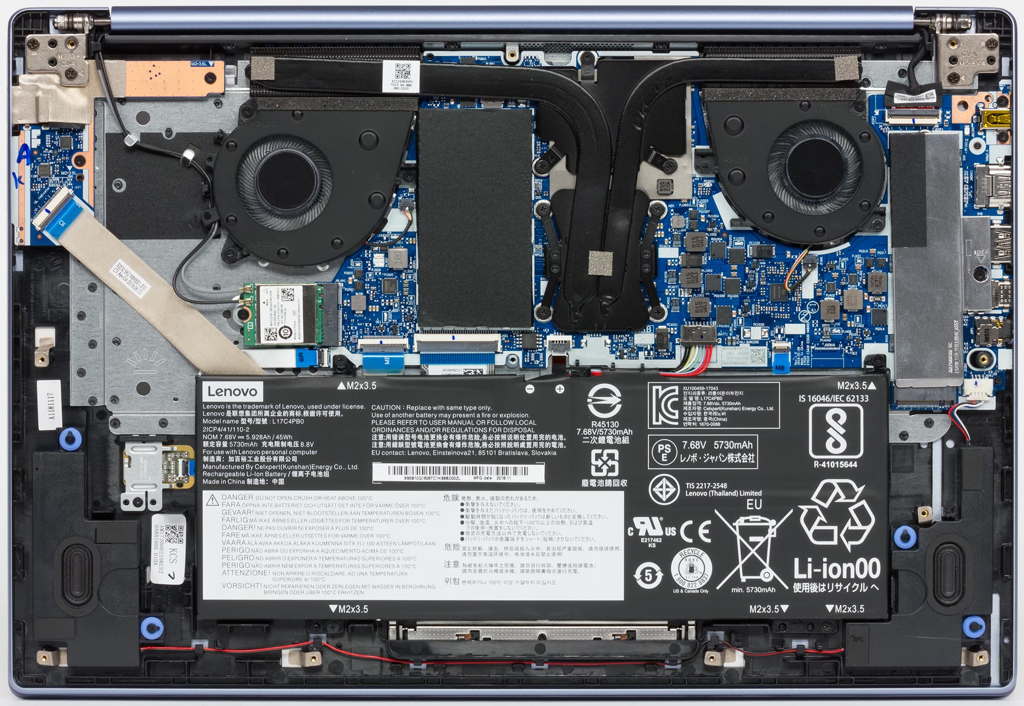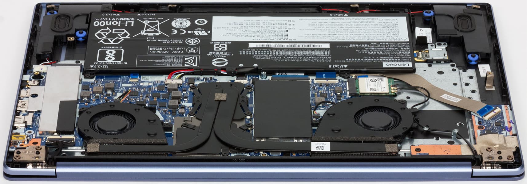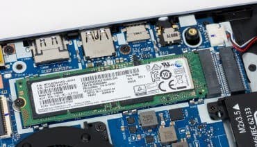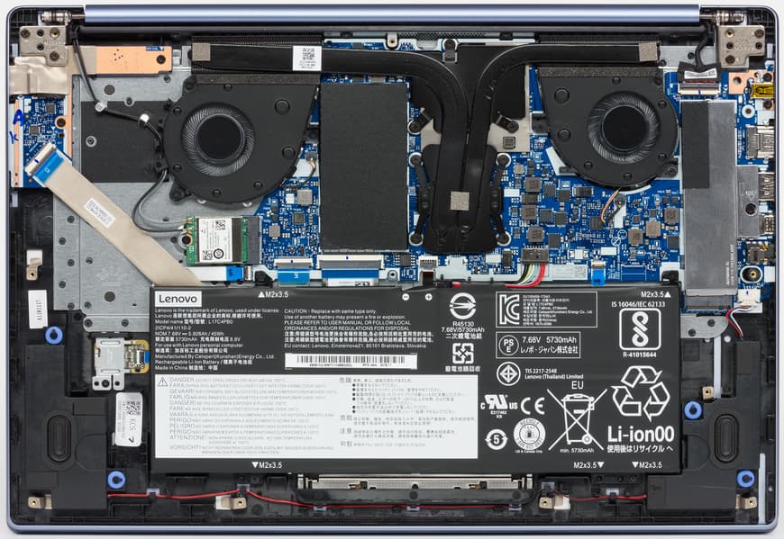Снять нижнюю панель корпуса в целом не сложнее, чем обычно, только придется использовать отвертку под шлиц Torx («звездочка»). Снятие панели открывает доступ к обоим кулерам, несъемной батарее, модулю беспроводной связи, модулю памяти в единственном слоте и двум слотам M.2 — в один из них (формата 2280) установлен системный SSD, второй (формата 2240) пуст.