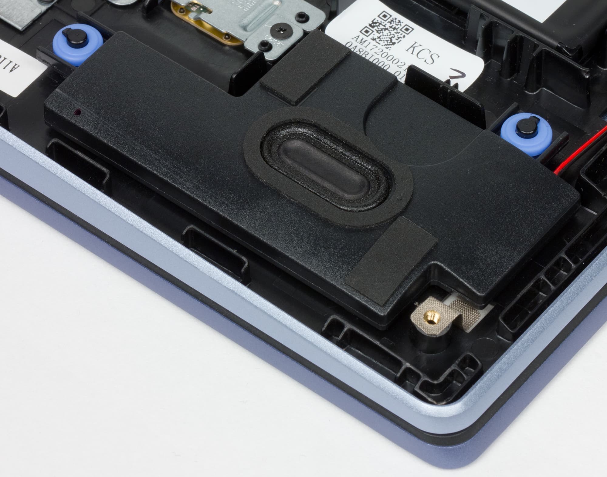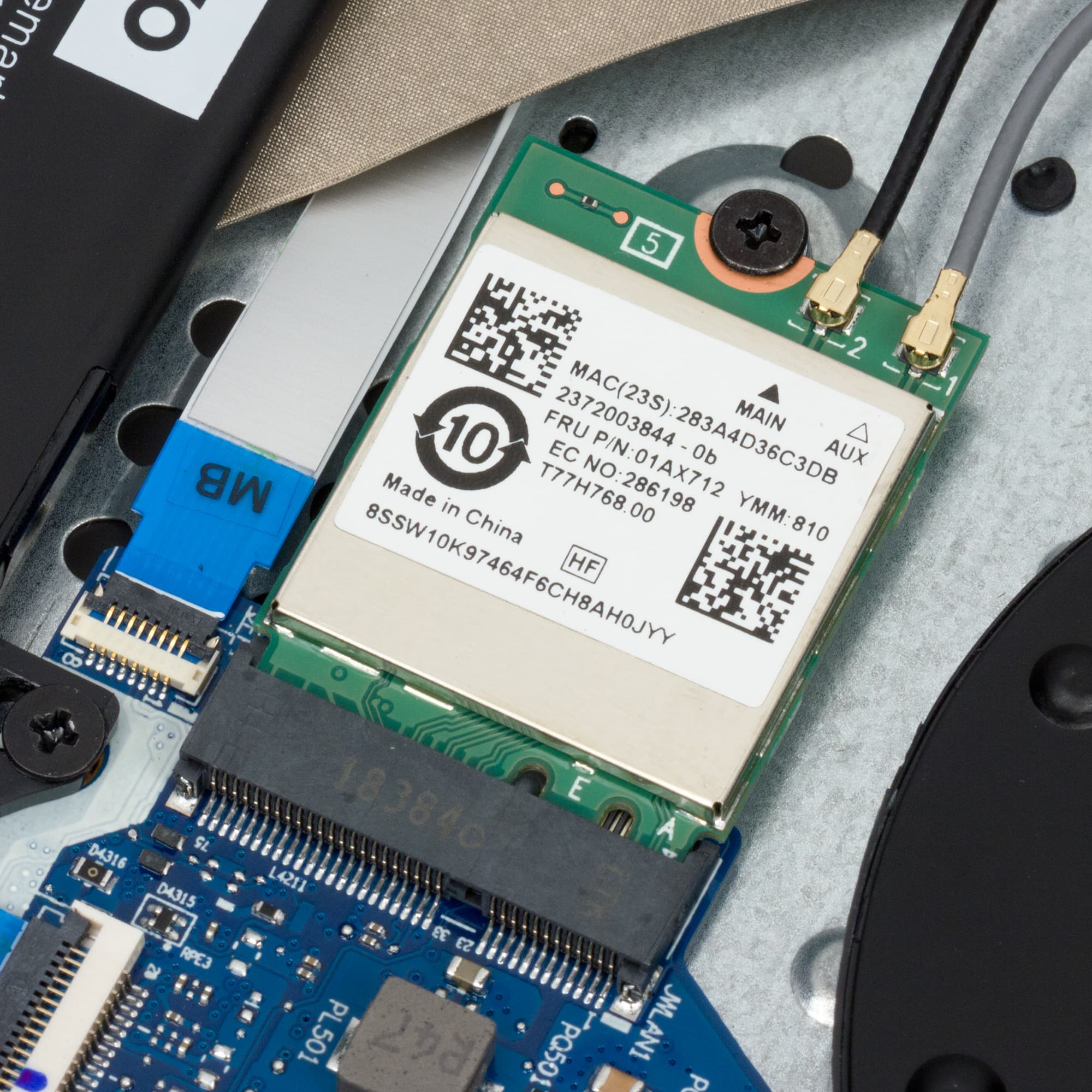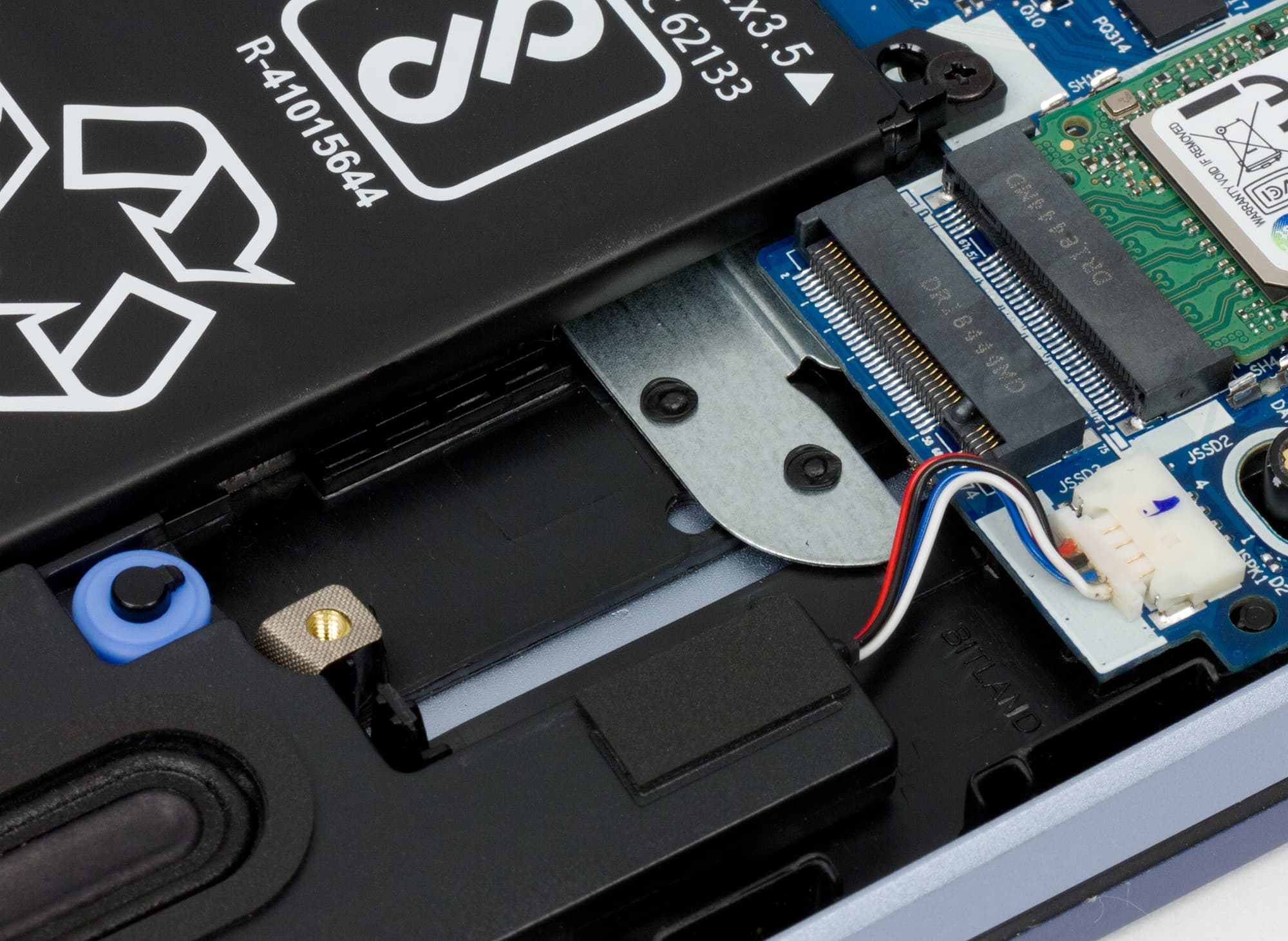 Снять нижнюю панель корпуса в целом не сложнее, чем обычно, только придется использовать отвертку под шлиц Torx («звездочка»). Снятие панели открывает доступ к обоим кулерам, несъемной батарее, модулю беспроводной связи, модулю памяти в единственном слоте и двум слотам M.2 — в один из них (формата 2280) установлен системный SSD, второй (формата 2240) пуст.