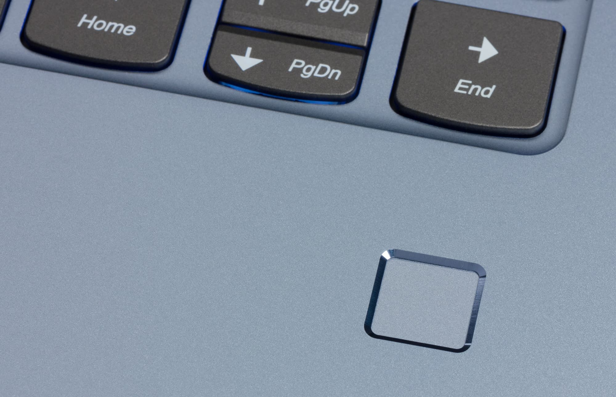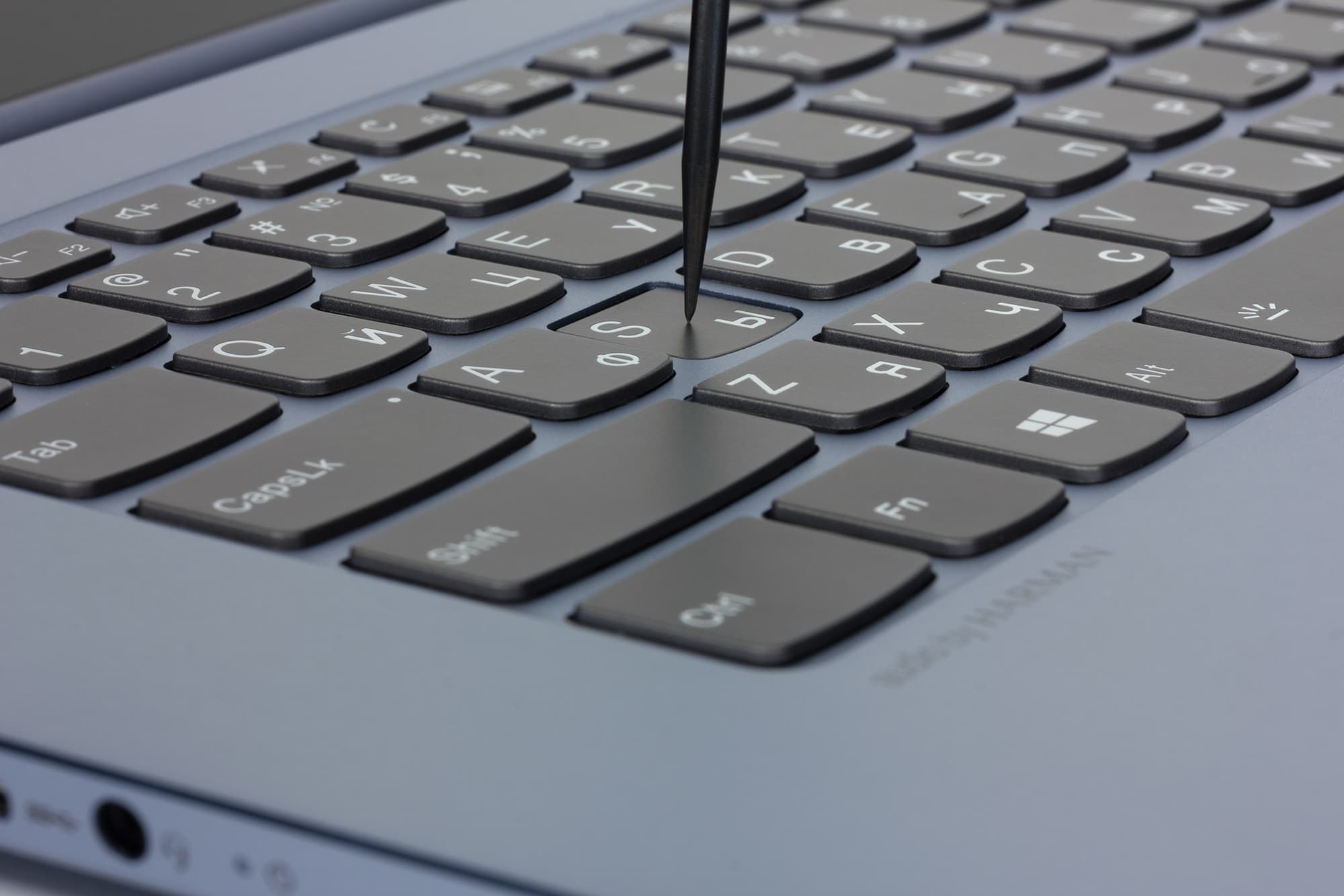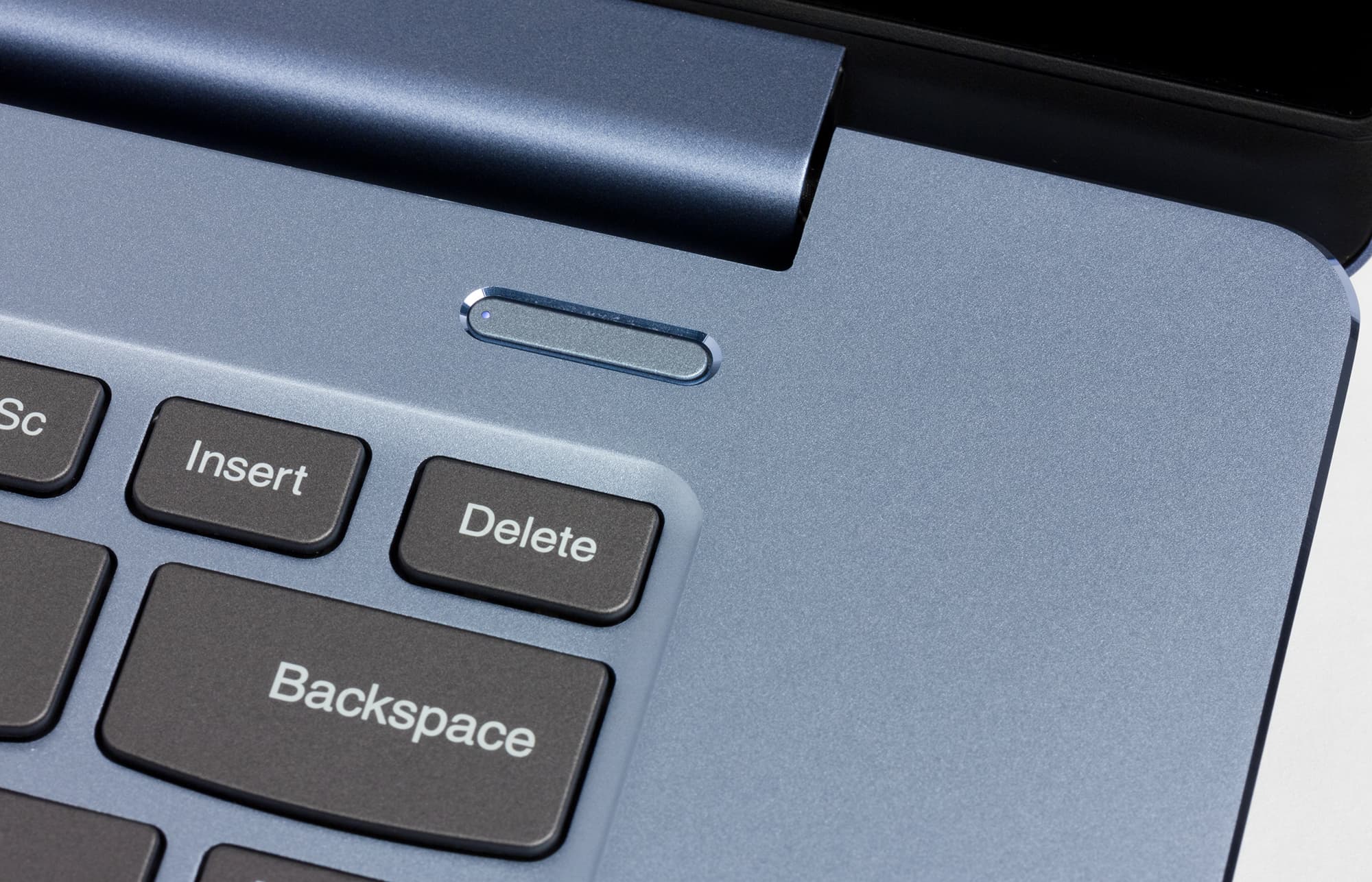 Сверху над клавиатурой расположена очень узкая кнопка питания, нащупывать и нажимать ее не слишком удобно, и вообще такая экономия на размере выглядит странно с учетом большого окружающего пространства. В кнопку встроен светодиод, который функционирует так же, как индикатор на левом боку корпуса. Внизу под клавиатурой есть маленькая площадка сканера отпечатков пальцев. Это очень удобное решение, оно стандартно поддерживается встроенной функцией Hello в Windows 10 и позволяет как быстро разблокировать ноутбук, так и авторизоваться в различных сервисах. Работает сканер очень быстро и в целом безупречно.