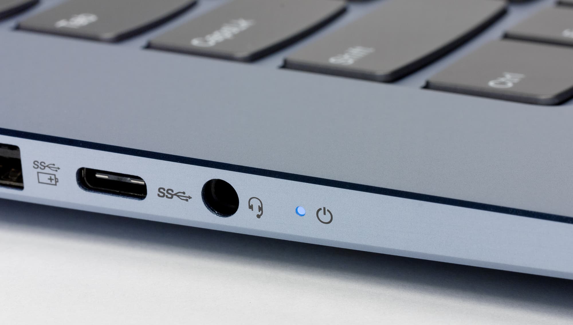 Рядом расположен индикатор состояния ноутбука: он горит молочно-белым при нормальной работе, цвет сменяется оранжевым при разряженном (менее 20% заряда) аккумуляторе. У усыпленного компьютера светодиод редко мигает текущим (белым или оранжевым, в зависимости от заряда) цветом. Светодиод у разъема питания оранжевым цветом оповещает об идущей зарядке, при наполнении аккумулятора до 80% цвет меняется на белый. О полном заряде аккумулятора ноутбук дополнительно никак не информирует.