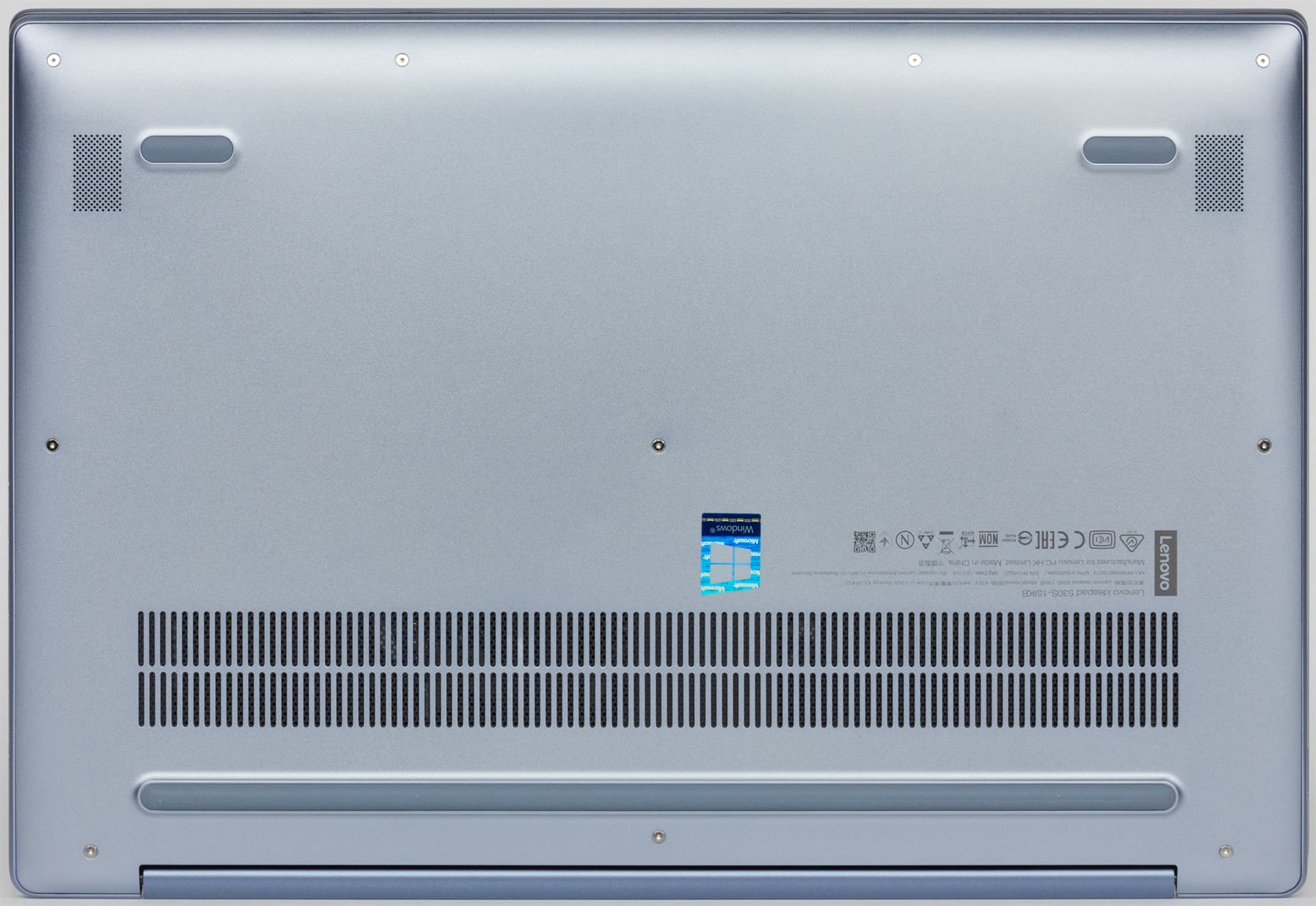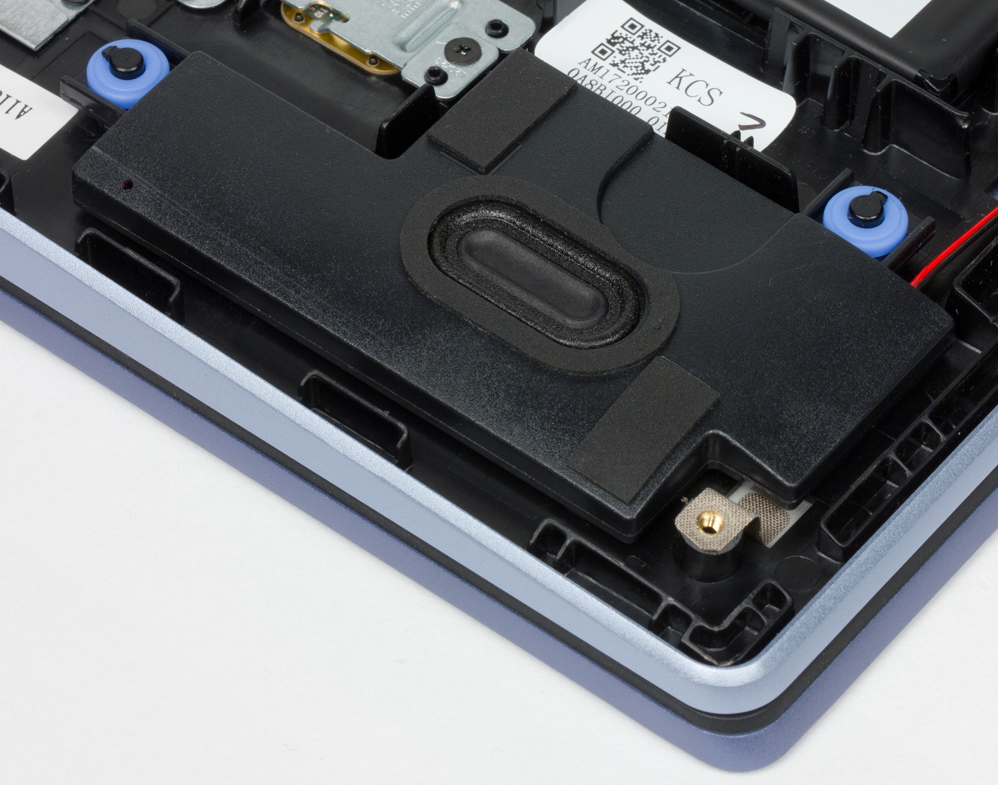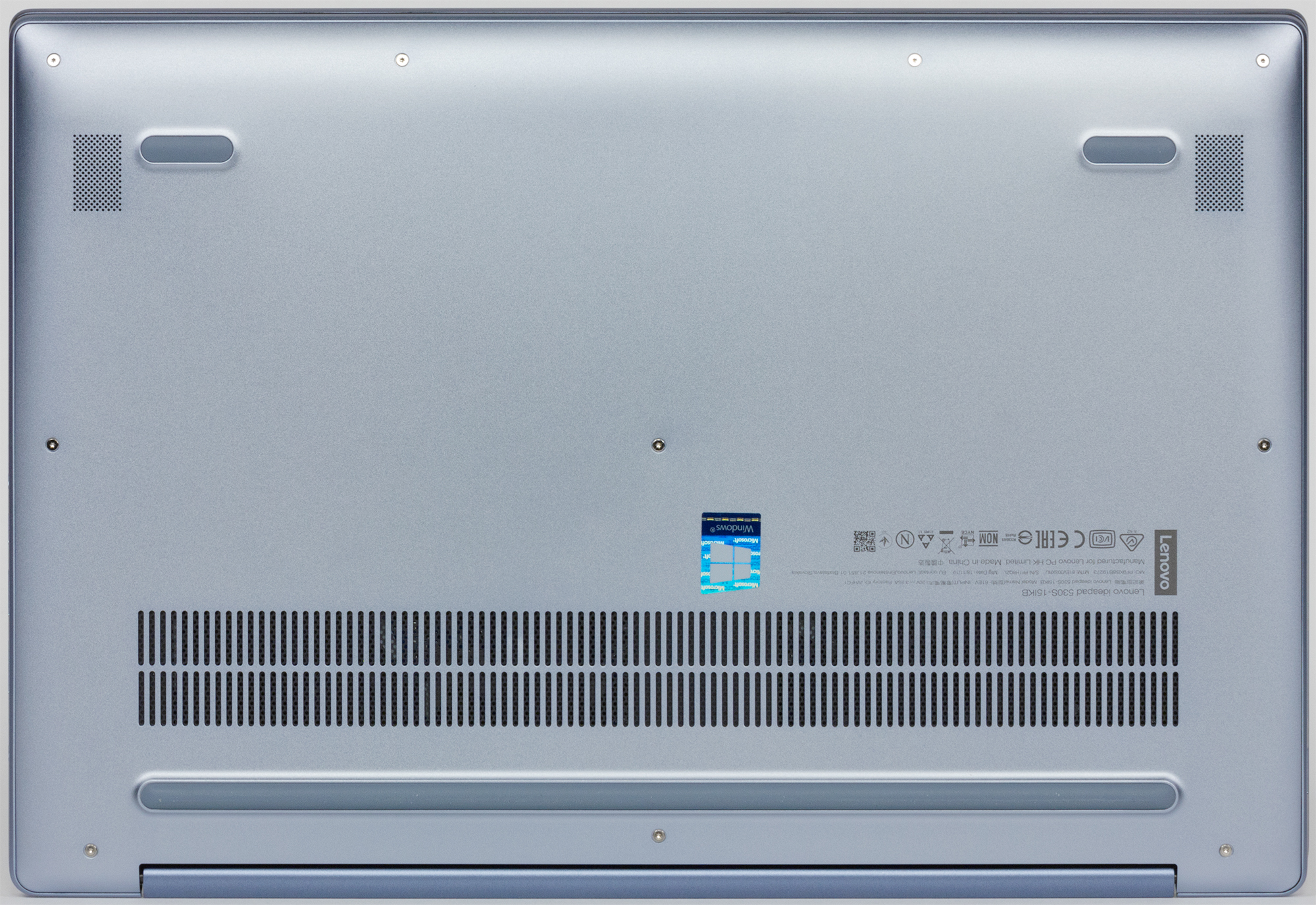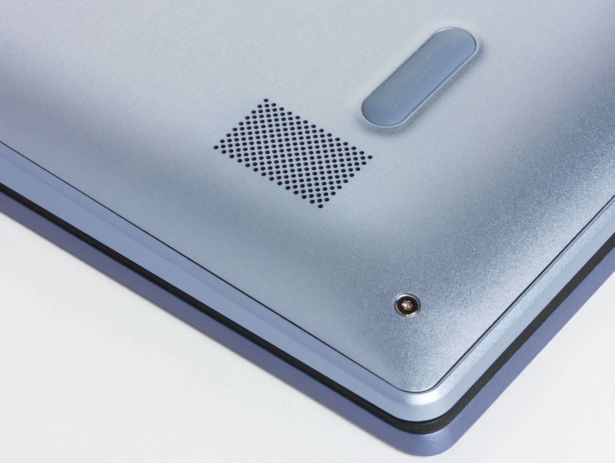 Динамики здесь расположены прямо на днище, но около маленьких резиновых ножек в передней части корпуса, так что установка ноутбука на стол не заглушает звук (а вот на кровать или на колени — теоретически может). Кроме этого, широкая полоса с перфорацией на днище служит для вентиляции: через нее два вентилятора внутренних кулеров всасывают холодный воздух. (Горячий воздух удаляется через вентиляционные отверстия, расположенные в задней части корпуса на плоскости, обращенной к кожуху на петлях крышки.)