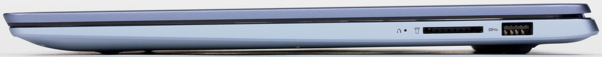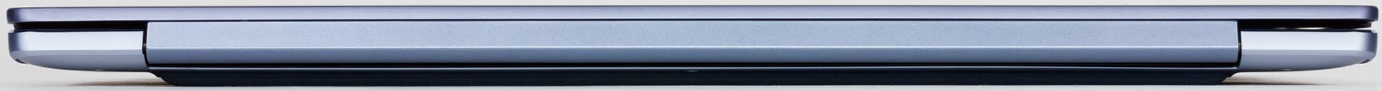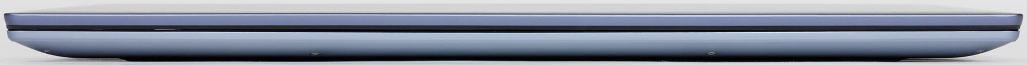 Металлическая поверхность матовая, без какого-либо узора. Кисти рук комфортно скользят по рабочей поверхности из алюминия, но в то же время ноутбук слишком скользкий, чтобы надежно удерживать его вертикально одной рукой — например, доставая из рюкзака. Тут поможет отчетливо выпуклая полоска с резиновым покрытием вдоль заднего края на днище: она вкупе с перфорацией вентиляционных отверстий обеспечивает достаточно надежное сцепление с пальцами.