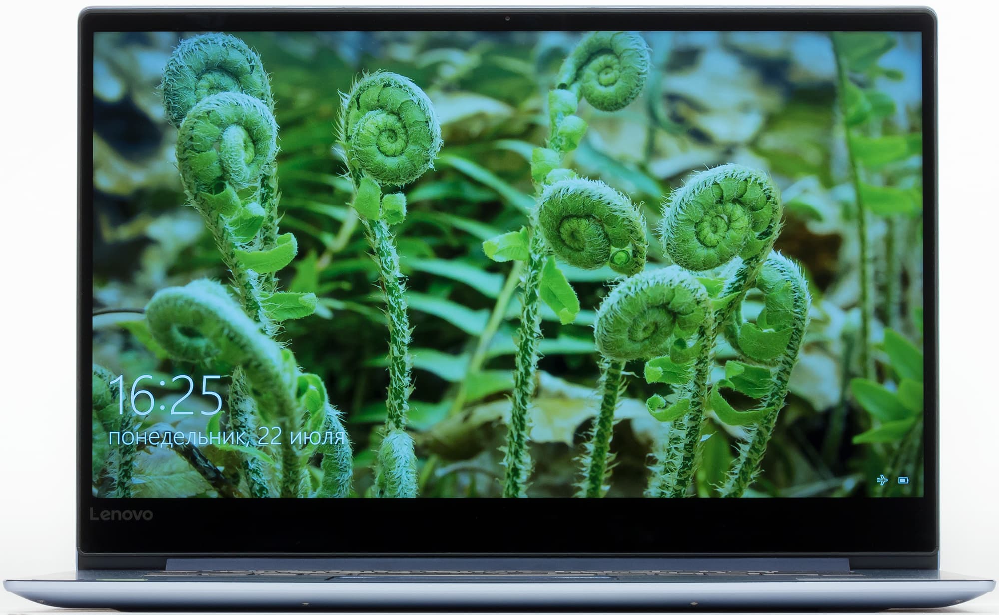 Внутренняя поверхность крышки в нашем случае прикрыта стеклянной пластиной с очень тоненькой алюминиевой рамкой-бортиком вокруг. Однако до краев экрана под стеклом еще много места, толщина отступов составляет по 6 мм слева и справа, 10 мм сверху и 23 мм снизу (если считать от края стеклянной пластины, которая не доходит до края крышки). При этом на верхней части рамки разместилась веб-камера с сигнальным светодиодом, а на толстой нижней — только еще одна надпись «Lenovo» (но хотя бы в углу).