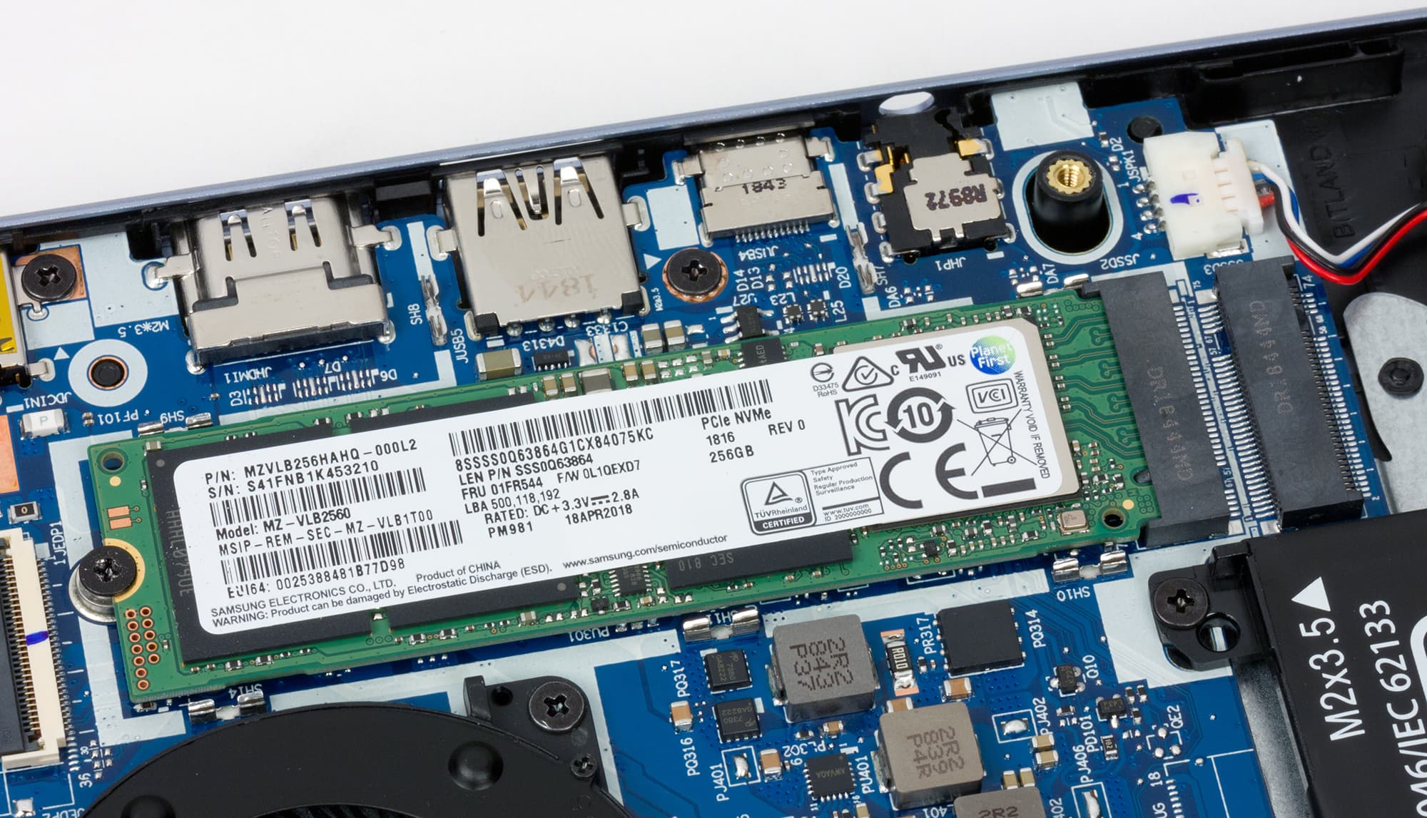 Напомним, в нашем ноутбуке применен SSD Samsung PM981 на 256 ГБ. Это NVMe-накопитель, установленный в слот M.2 и подключенный к внутреннему порту PCIe x4.