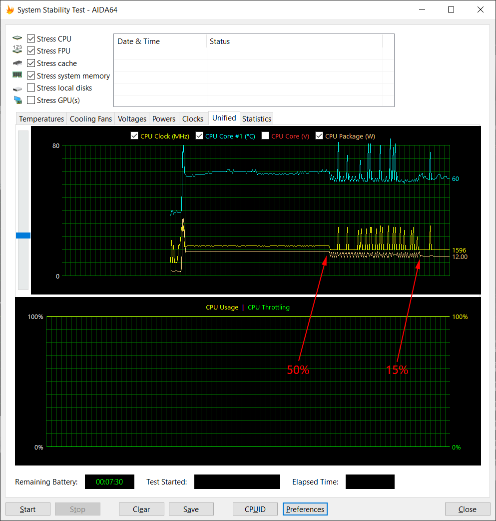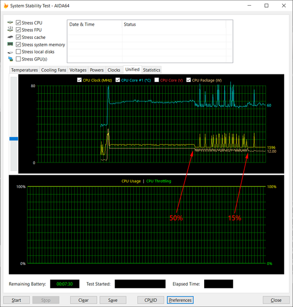 При включении максимальной нагрузки на процессор тот пытается поднять частоту до своих максимальных 3,4 ГГц (ограничение на его энергопотребление в этот момент ослаблено до 44 Вт), но удается ему это всего на пару секунд, в таком режиме некоторые ядра сразу же начинают перегреваться. Кулеры раскручиваются, частота процессора снижается до 1,7-1,8 ГГц (на всех ядрах), а потребление процессора падает до штатных 15 Вт TDP. В таком режиме ноутбук может, судя по всему, функционировать неограниченно долго, причем изредка делая попытки поднять частоту процессора до максимальной (с тем же успехом). Температура ядер при этом находится на уровне 70-75 °C, перегрева и тротлинга нет.