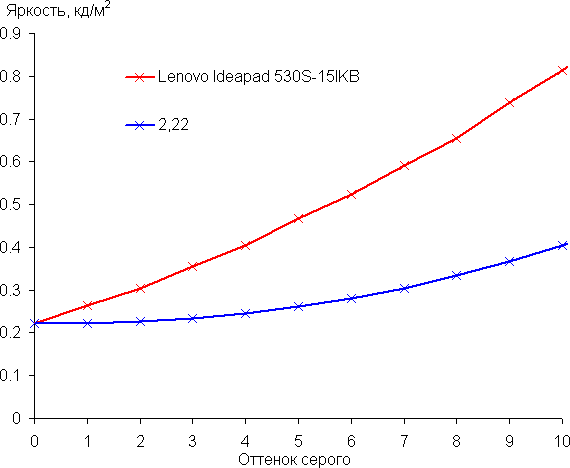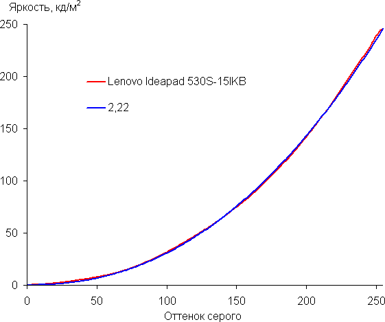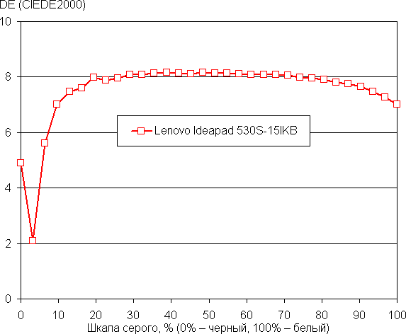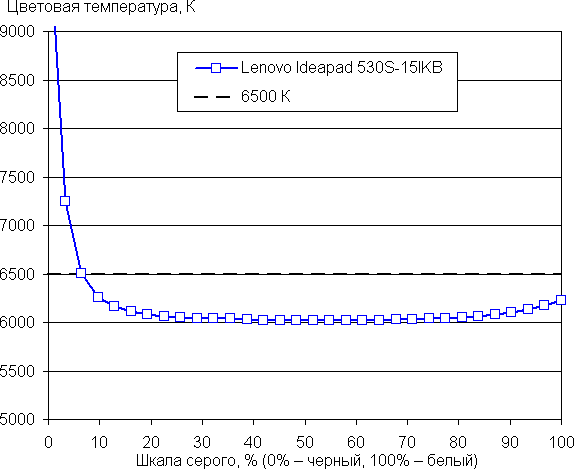 Подведем итоги. Экран ноутбука Lenovo Ideapad 530S-15IKB имеет низкую максимальную яркость, поэтому устройством проблематично будет пользоваться светлым днем вне помещения. В полной темноте яркость можно понизить до комфортного уровня. К достоинствам экрана можно отнести различимость деталей в тенях и хороший цветовой баланс. К недостаткам — низкую стабильность черного к отклонению взгляда от перпендикуляра к плоскости экрана и бледные цвета (узкий цветовой охват). В целом качество экрана не очень высокое, но для работы в офисных программах и в помещении даже такого качества более чем достаточно, да и матрица все же IPS.