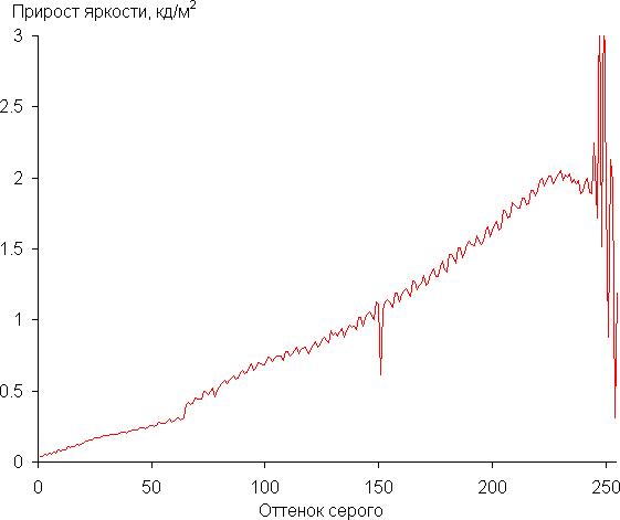 Далее мы измерили яркость 256 оттенков серого (от 0, 0, 0 до 255, 255, 255). График ниже показывает прирост (не абсолютное значение!) яркости между соседними полутонами: