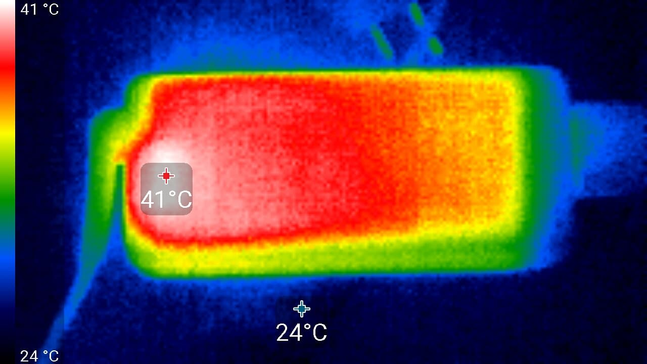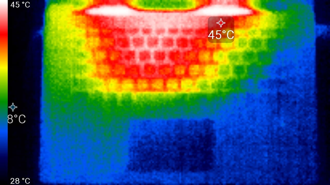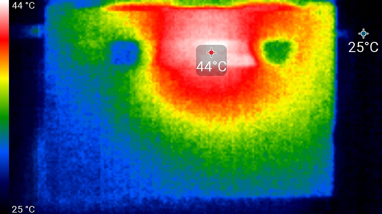 Под максимальной нагрузкой работать с клавиатурой комфортно, так как места под запястьями греются слабо. Держать ноутбук на коленях не доставляет особого дискомфорта, поскольку в соответствующих местах нагрев незначительный. На термоснимке экрана видны две нагретые области в нижней части — в эти места попадает горячий воздух из вентиляционной решетки на дальнем от пользователя торце корпуса ноутбука. Эти пятна скрадывают нагрев от светодиодной линейки подсветки, которая явно располагается в нижней части экрана. Блок питания греется незначительно, у него явно есть запас мощности и на более высокое потребление процессором, зарядку батареи и на питание не очень мощных периферийных устройств, подключенных к ноутбуку.