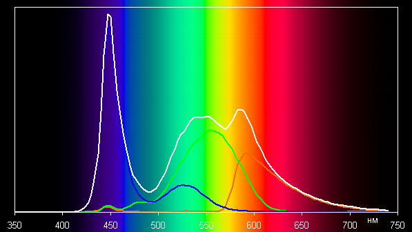 Такой спектр с относительно узким пиком синего и с широкими горбами зеленого и красного цветов характерен для экранов, в которых используется белая светодиодная подсветка с синим излучателем и желтым люминофором. Видно, что светофильтры матрицы существенно подмешивают компоненты друг к другу. Это сужает цветовой охват (цвета становятся бледнее), но позволяет получить бо́льшую яркость при меньших затратах энергии на подсветку.