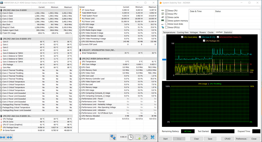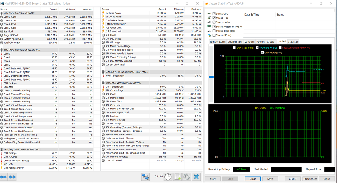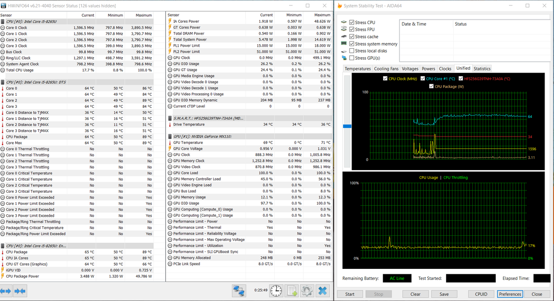 При чисто синтетической максимальной нагрузке на видеоускоритель (без загрузки процессора) потребление процессора составляет 2-3 Вт, частота ядер — стабильные 1,6 ГГц, их температура находится в районе 63-64 градусов, перегрева и тротлинга также нет. Видеокарта GeForce MX110 работает под нагрузкой при частоте ядра на уровне 890 МГц (максимум — 1 ГГц), память всегда работает на 1,25 ГГц, GPU нагревается максимум до 70-71 °C.