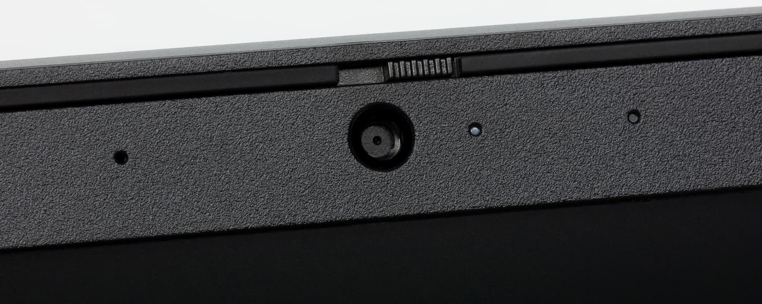 Пластиковая рамка вокруг экрана немаленькая, толщина отступов составляет по 8 мм слева и справа, 19 мм сверху и 22 мм до кожуха на петлях снизу. На нижней части рамки ничего нет, а сверху разместились веб-камера со светодиодом активности и одним микрофоном. Качество картинки у камеры совсем плохонькое (разрешение 0,3 Мп — еще не самое страшное в ней), но есть и неожиданный плюс: задвигаемая вручную шторка, которая просто физически перекрывает объектив и гарантирует таким образом защиту от подглядывания за вами через интернет. Сэкономим изоленту!