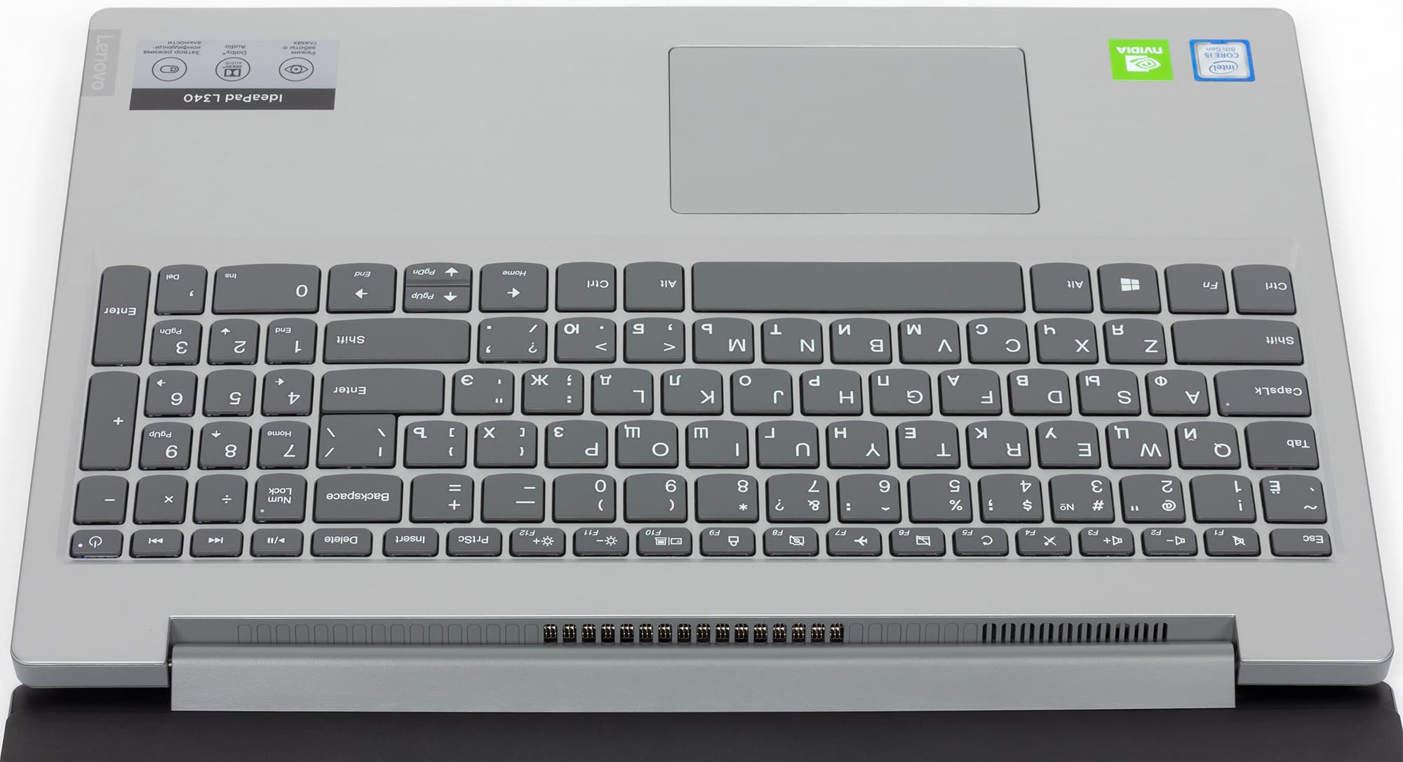 За раскладку клавиатуры мы Lenovo в целом похвалим: раз уж ноутбук все равно не претендует на звание вершины стиля, в него просто установили нормальную клавиатуру почти на всю ширину корпуса — без подсветки и странного шрифта символов, но с цифровым блоком при нормальном размере основных клавиш. Клавиши стандартные, тихие мембранные, удобные. Расстояние между центрами клавиш в одном ряду составляет 19 мм, а между их краями — 3 мм. Ход клавиш — 1,5 мм.