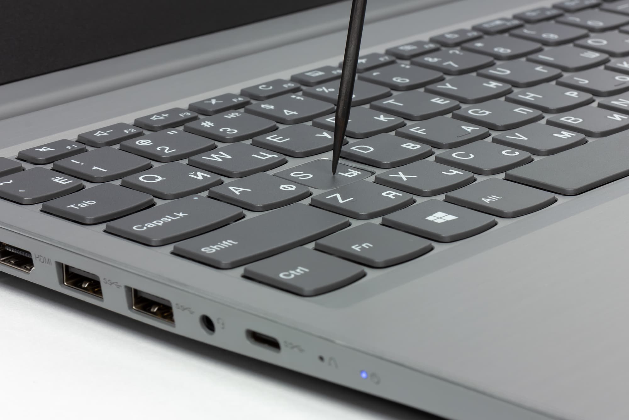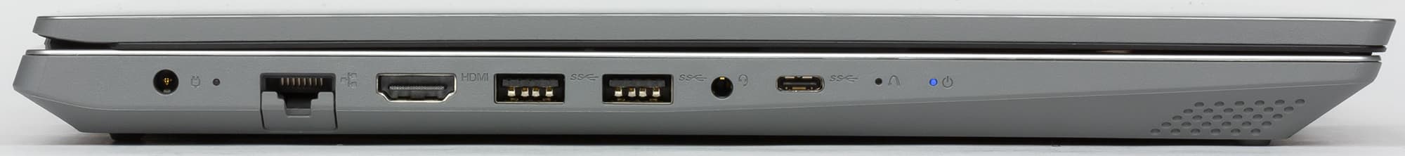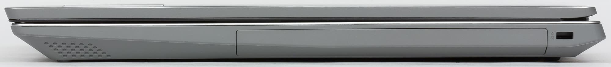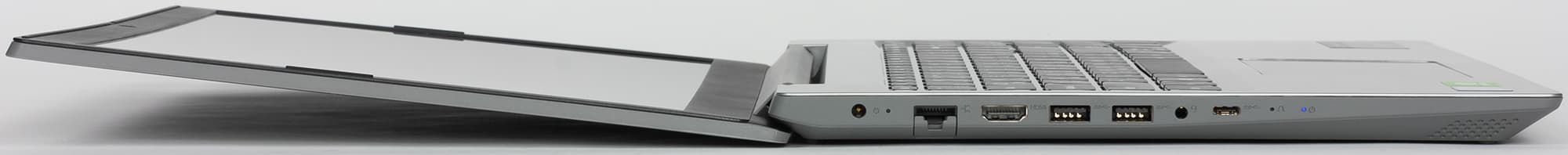 Итак, на левом боку находятся разъем питания под фирменный круглый в сечении штекер, сетевая розетка, видеовыход HDMI, пара USB 3.0/3.1 Type-A, миниджек для подключения гарнитуры, один USB 3.0/3.1 Type-C и скрытая кнопка Novo. Запуск ноутбука этой кнопкой (на нее надо нажимать скрепкой или чем-нибудь подобным) позволяет войти в BIOS Setup, выбрать загрузочное устройство или запустить средство восстановления операционной системы — Microsoft Diagnostics and Recovery Toolset (DaRT). Для разъема RJ-45 (да, 8P8C) толщины верхней части боковины тоже недостаточно, так что он частично закрыт оттягиваемой подпружиненной крышкой. Звучит страшновато, но на деле Ethernet-кабель легко втыкается в разъем не глядя и нормально фиксируется в разъеме на время работы, тут проблем нет.