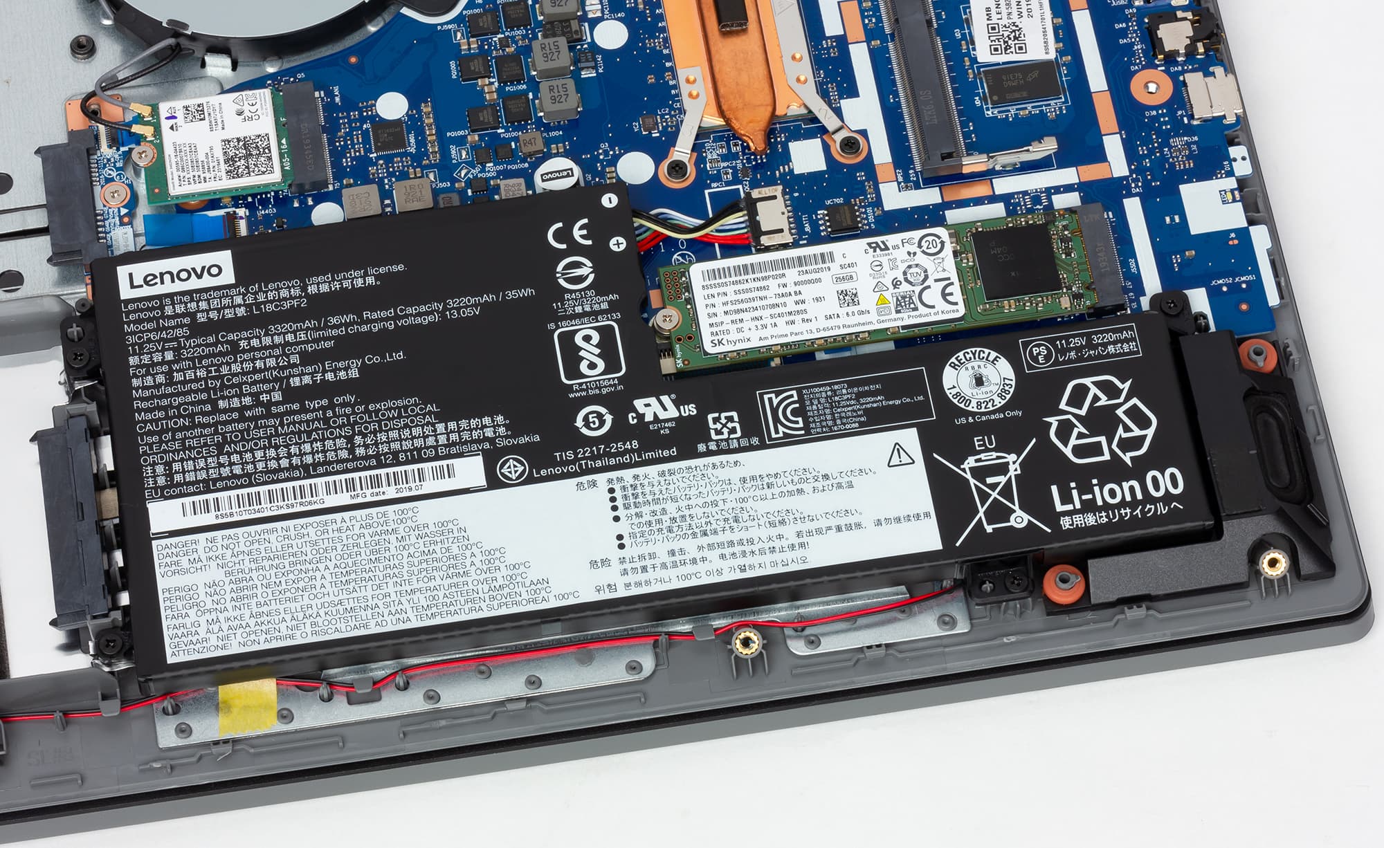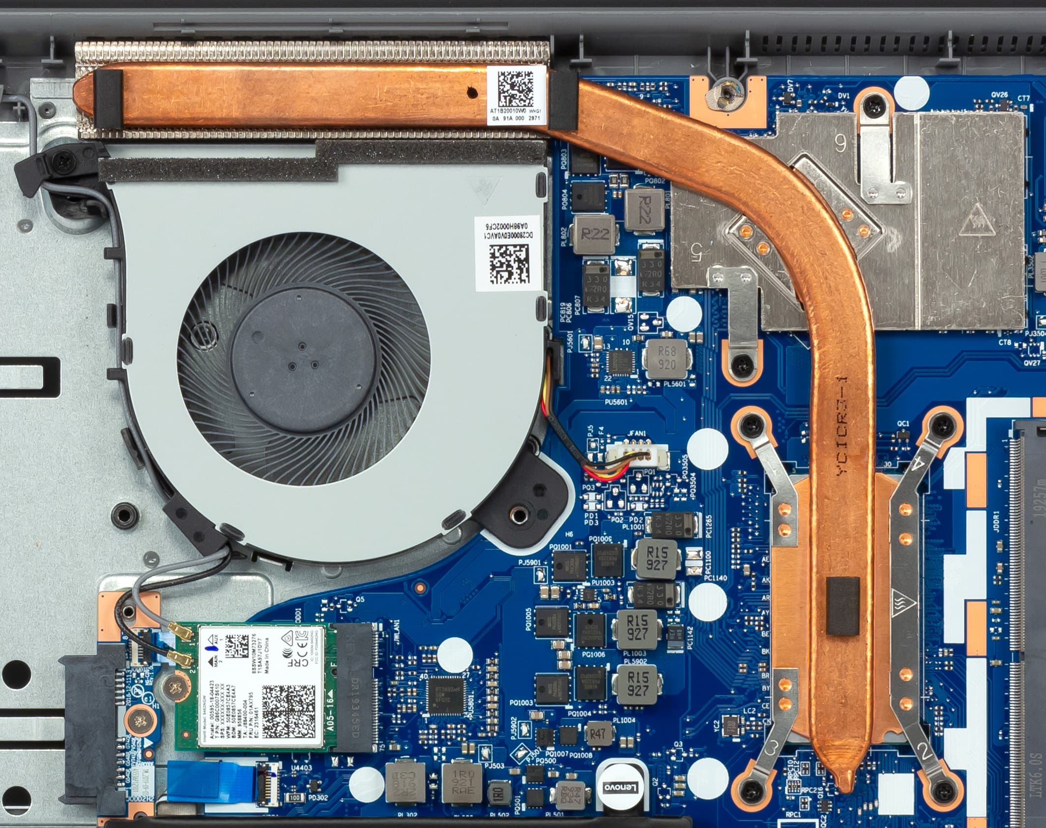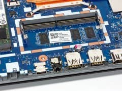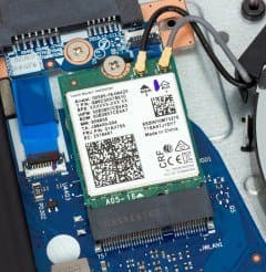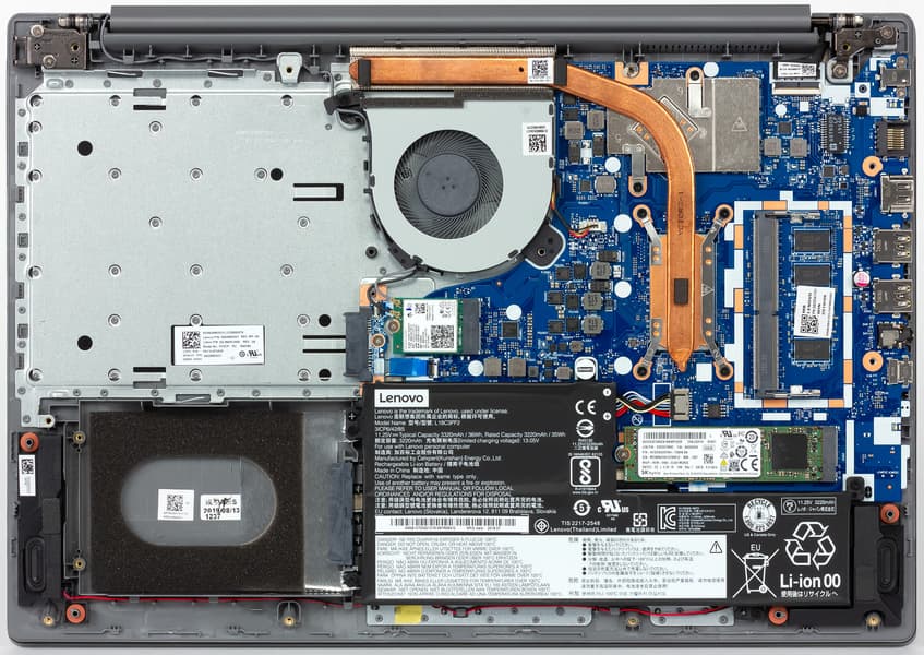 Нижняя панель корпуса снимается после откручивания 13 винтиков — к счастью, обычной крестовой отверткой. Снятие панели открывает доступ ко всем существенным компонентам: кулеру, несъемной батарее, модулю беспроводной связи, единственному слоту для модуля памяти, накопителю в слоте M.2, а также к отсеку для установки 2,5-дюймового накопителя и к отсеку для установки оптического дисковода (в него через переходник можно установить еще один 2,5-дюймовый накопитель). В нашей модификации ноутбука ни дисковода, ни винчестера не было, но возможны другие модификации. В любом случае, три места для установки накопителей в ноутбуке есть, это всегда полезно.